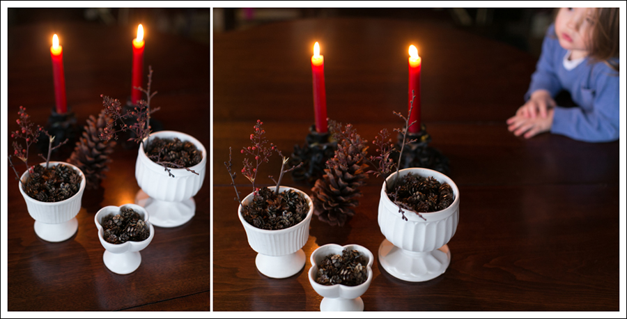 A few days went by (ok, weeks). I never made it to the store to get glitter. Faced with Christmas less than a week away, I just dumped the pine cones in a few vases and called it good. We both like it!