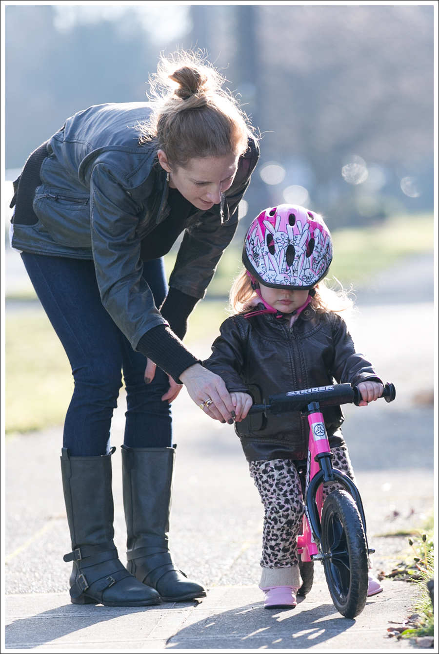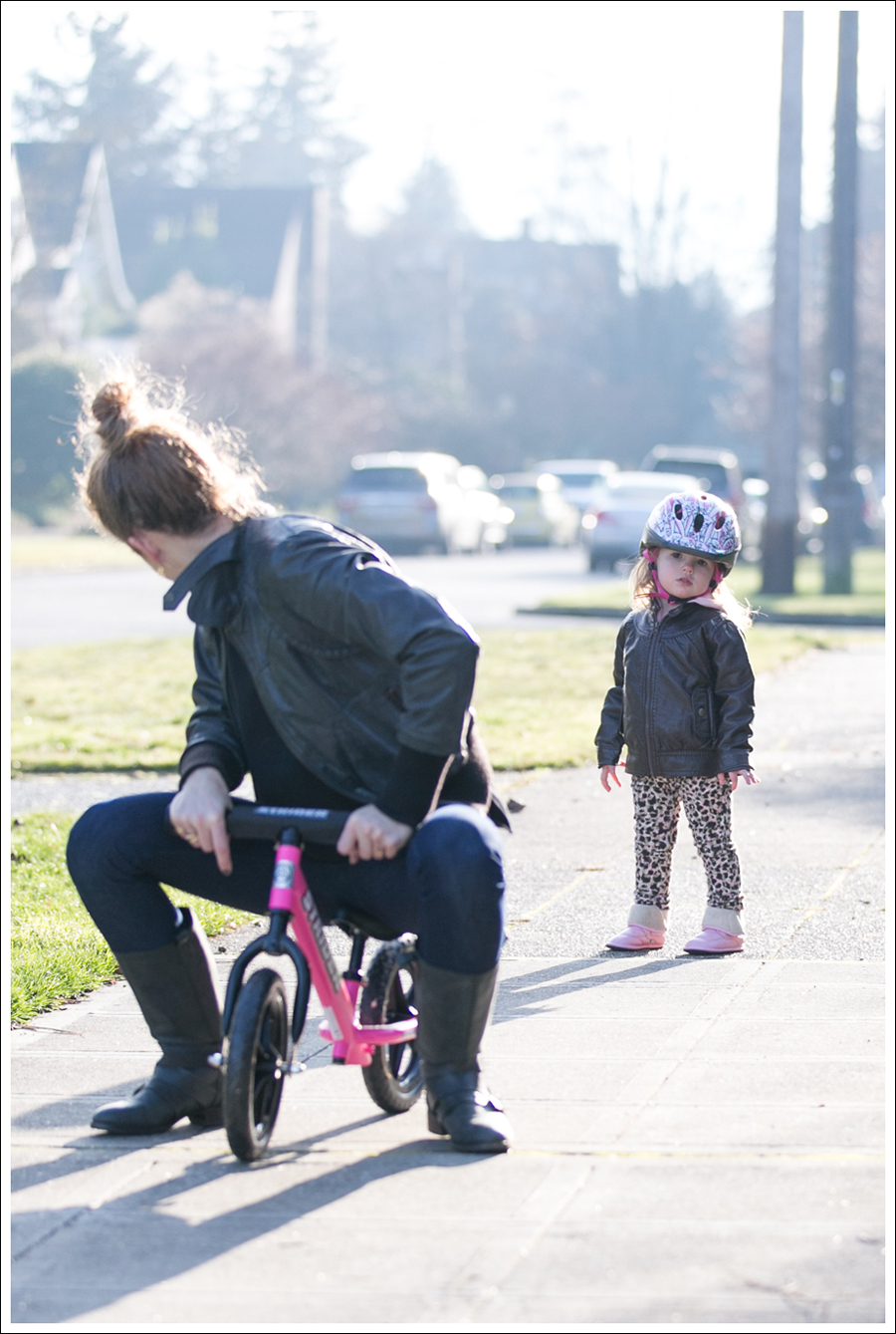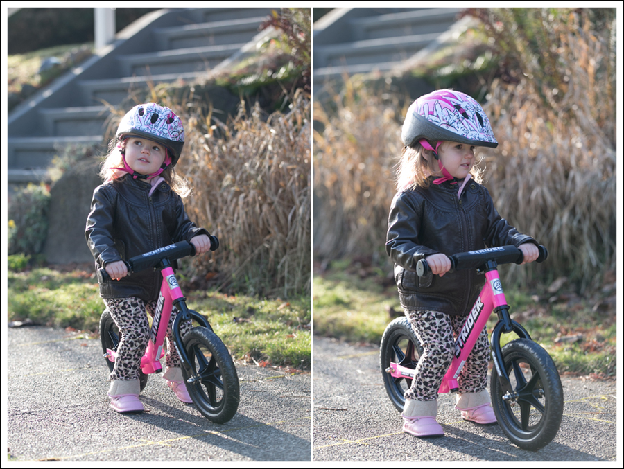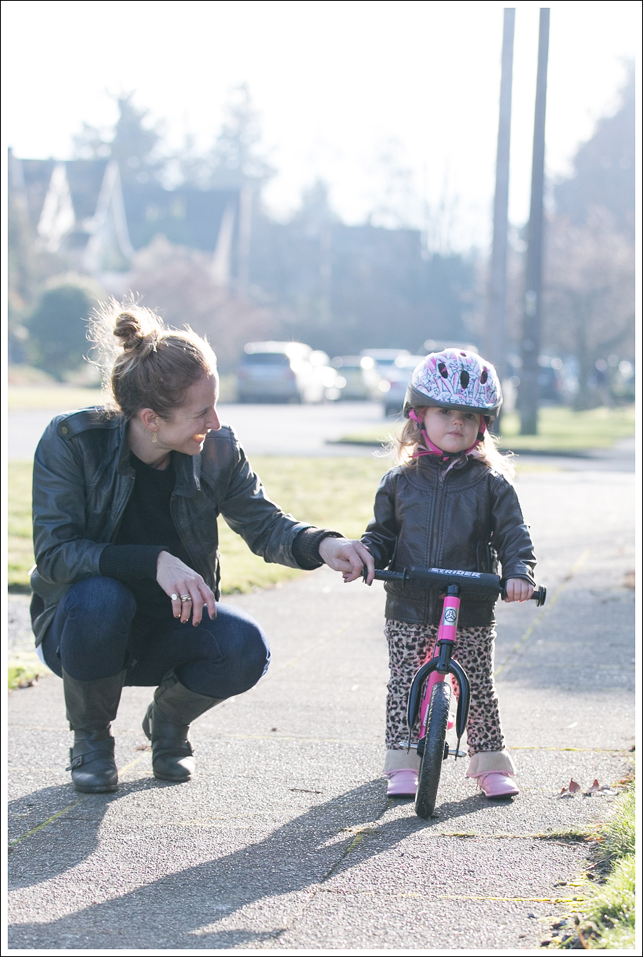 Maya has been obsessed with bikes. Every time she sees one in the neighborhood, she wants to get on it. Every time she sees someone riding by “a-cycle! A-CYCLE!” So…that was her big present for Christmas. She got her helmet first, and put it on right away “A-CYCLE!!” She knew! The funniest part about these next images, are that they are in the order in which they happened, yet…completely backwards to how they probably should have happened!