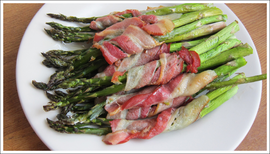 - Wrap one half strip bacon around 1 or 2 asparagus spears (depending on how fat/skinny they are), leaving tip and end exposed