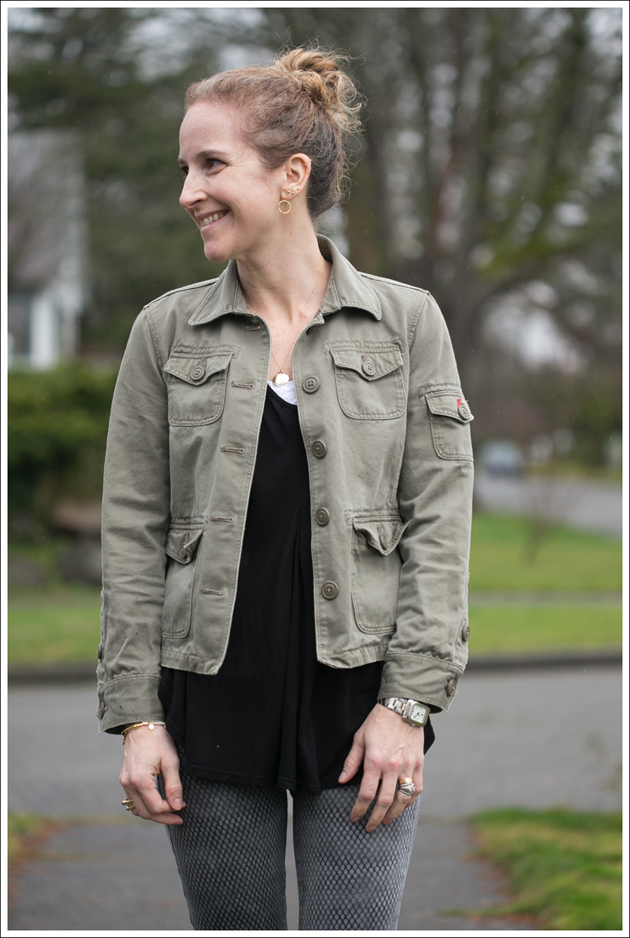 Military Jacket + Printed Jeans + Booties (almost all thrifted!)