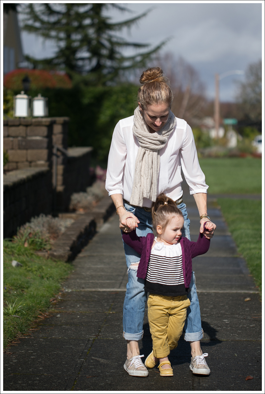 I’m pretty sure they meant a new way to tuck something in, but I am not a big tucker-inner (yes, I know that isn’t a word :)). I love when I see others tuck sweaters into their jeans, but when I do it, I just feel frumpy! So, I thought I’d try tucking something into a pair of boyfriend jeans that I’ve always just worn tight sweaters with.