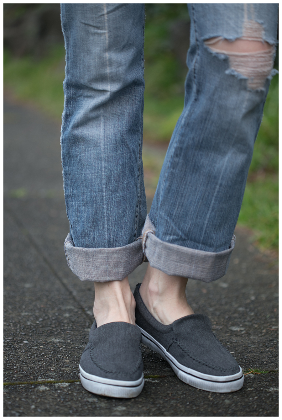 Here’s another Challenge that fell under two categories 🙂 Dressing up distressed jeans, and incorporating an office appropriate blouse into your weekend look.