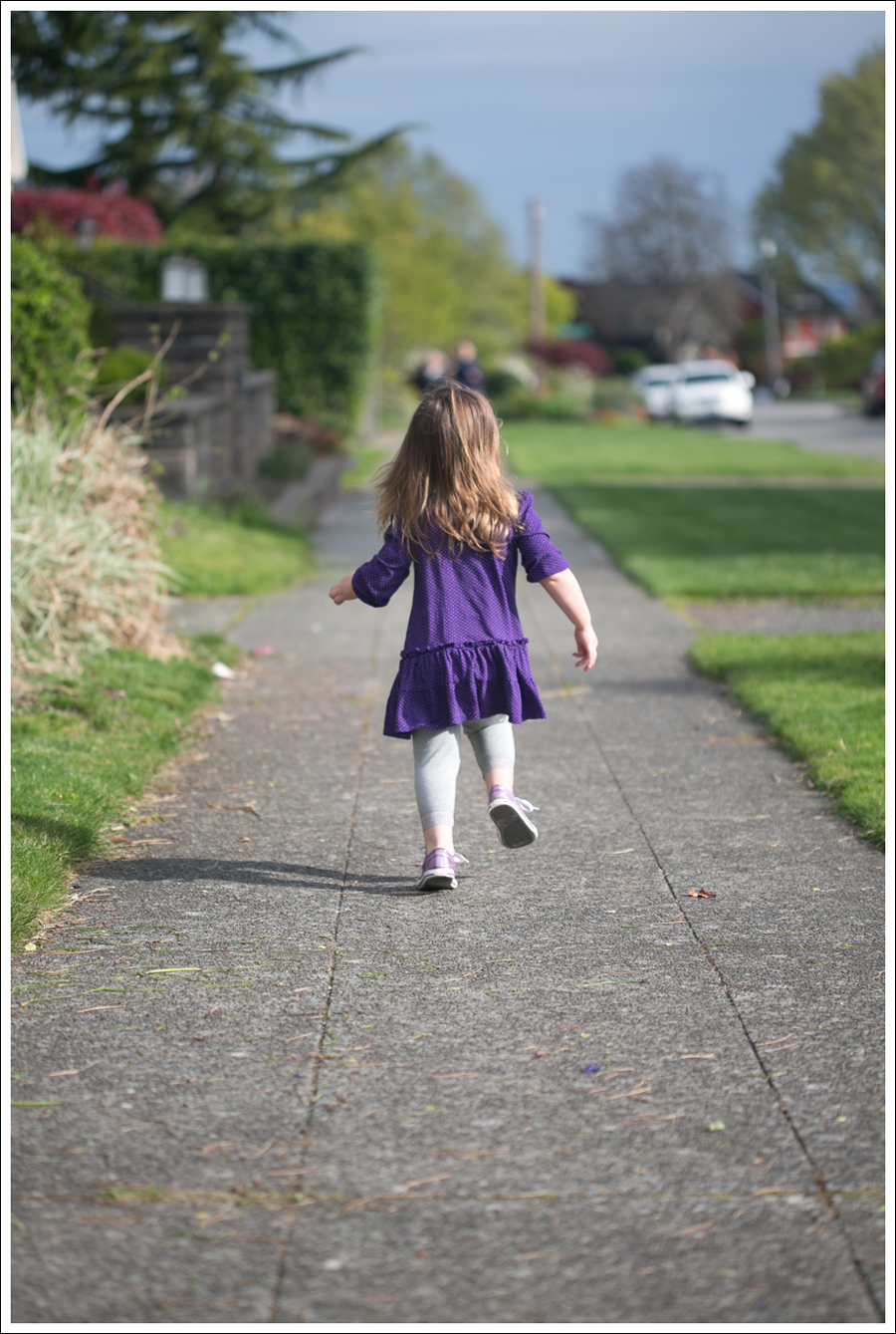 You can’t really see them, but Maya’s running to meet my parents as they come down the block from their walk (that we had to miss out on :() They were nice enough to watch Maya while I had to work. Once she sees them, it’s “Bye Mommy! Going to Meme and BOPO’s!!” 🙂