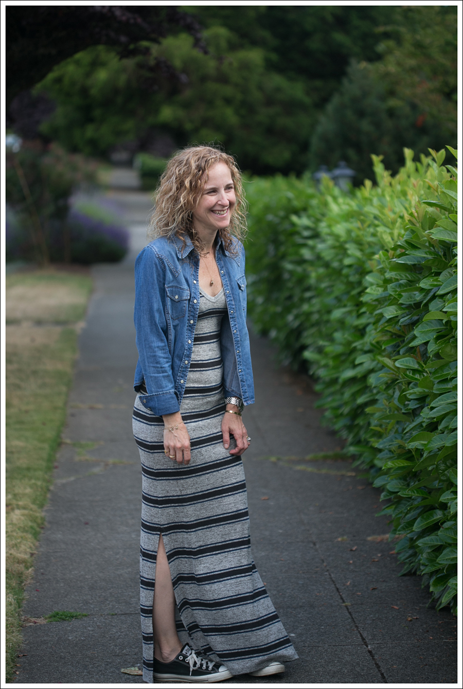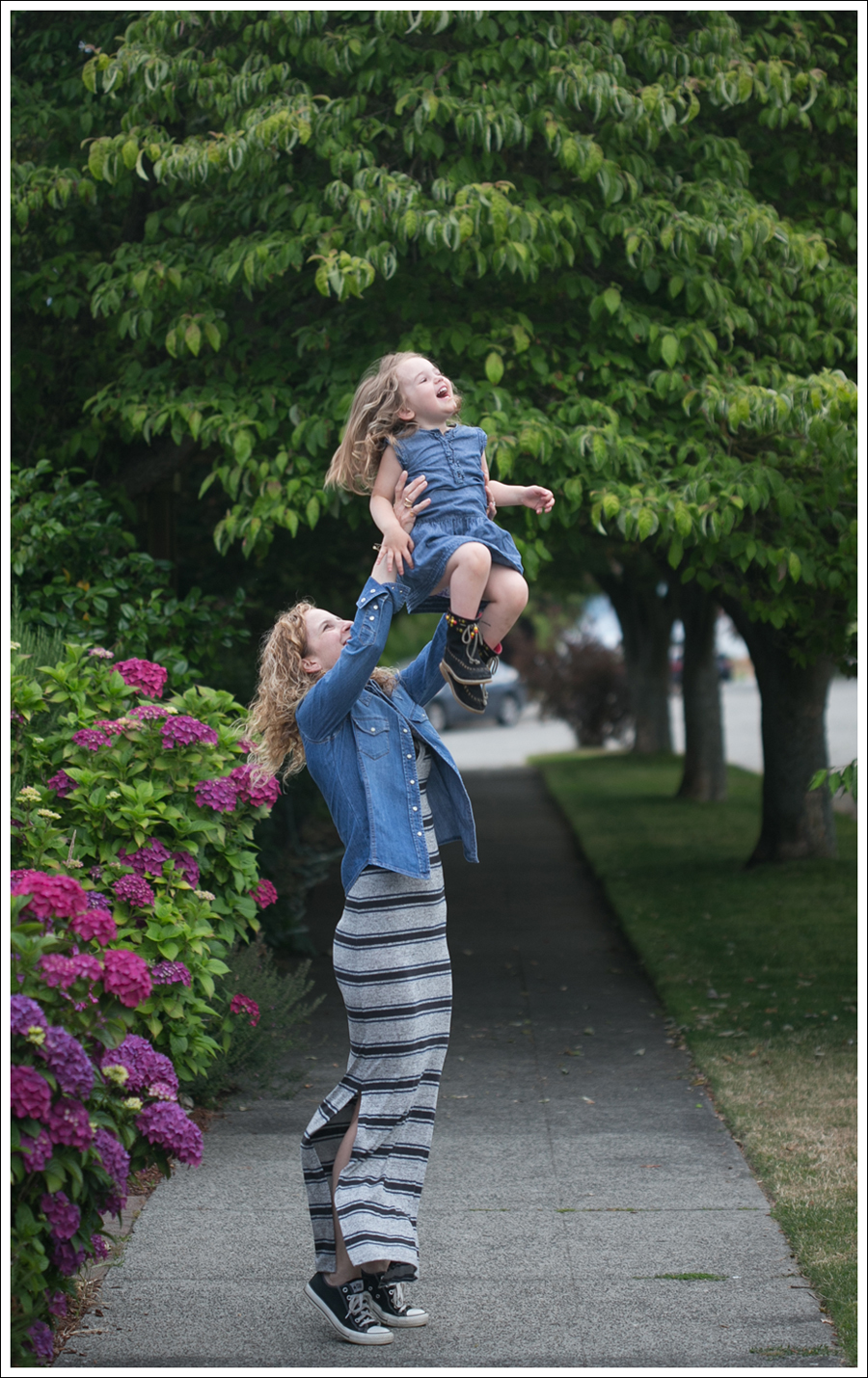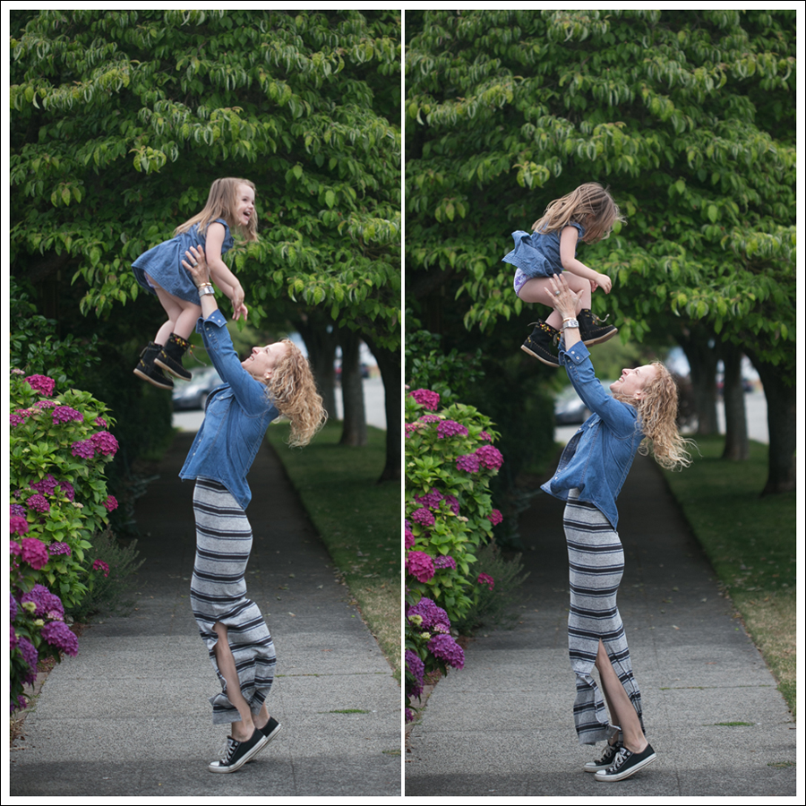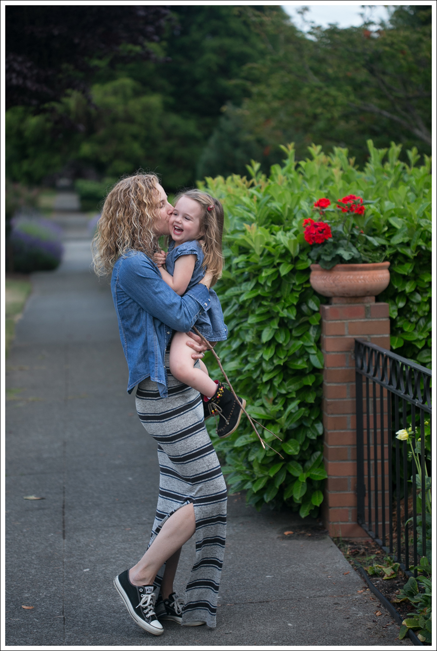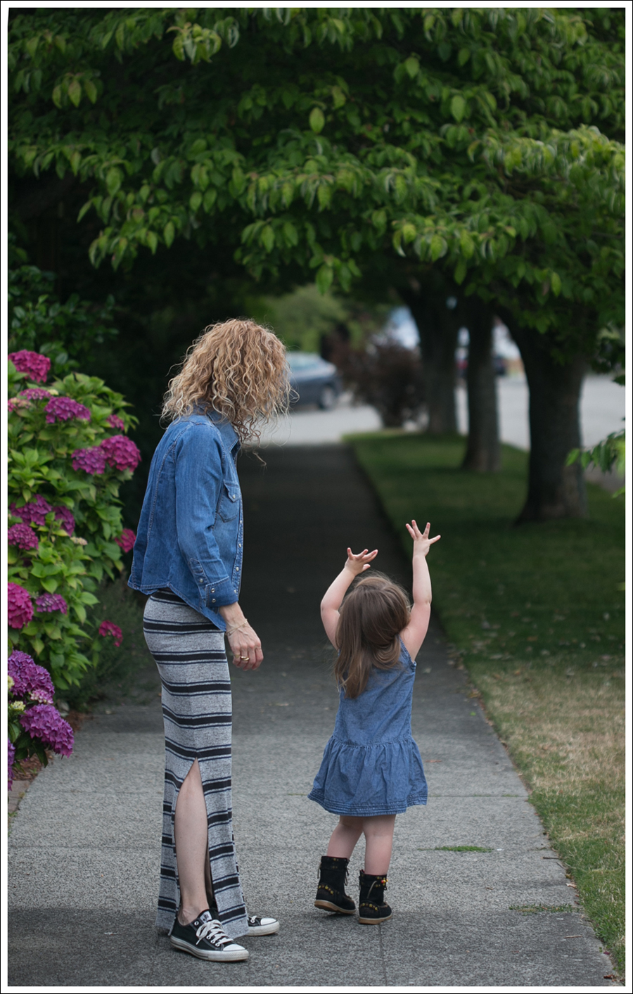 I honestly didn’t even plan on making this an all thrifted outfit for both me and Maya, but chances are…that’s going to happen more often than not 🙂 I’m sure it’s pretty obvious by now that I’m not really a dress person. In my mind, I feel way more comfortable in jeans and a tee, but whenever I actually wear a dress…I love it! The Huz loved this dress the minute I tried it on for him. It’s totally fitted (hence the Huz loving it!), so I threw on a denim shirt to make me feel a little less self conscious. The material is ridiculously soft and comfortable, and I love how the Converse make it more casual. Perfect for our night time walk around the neighborhood…