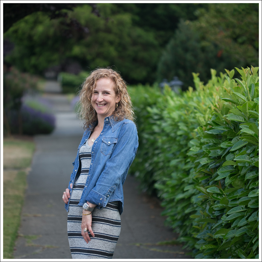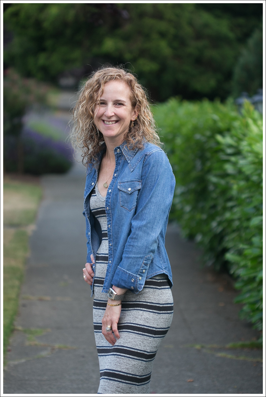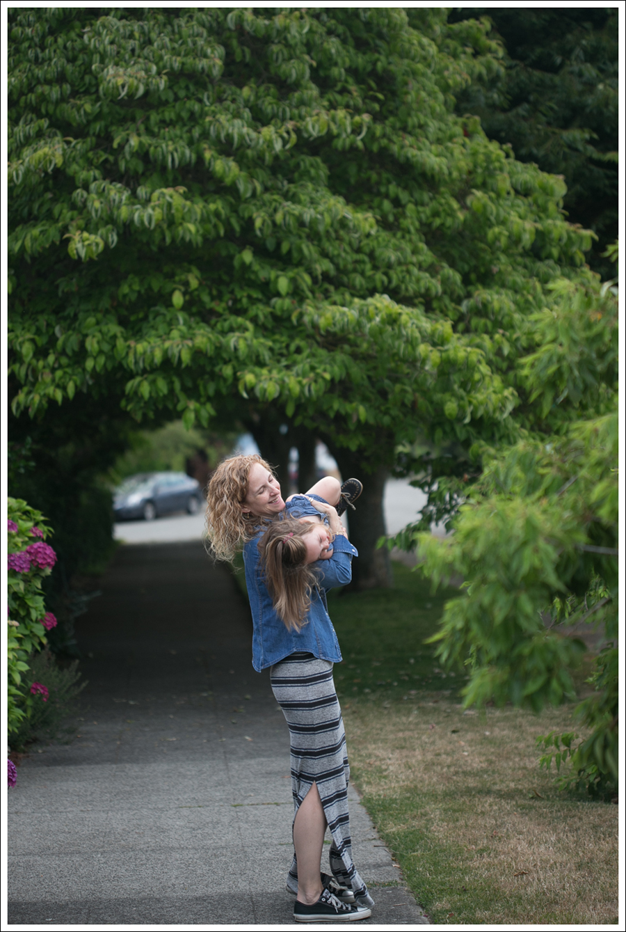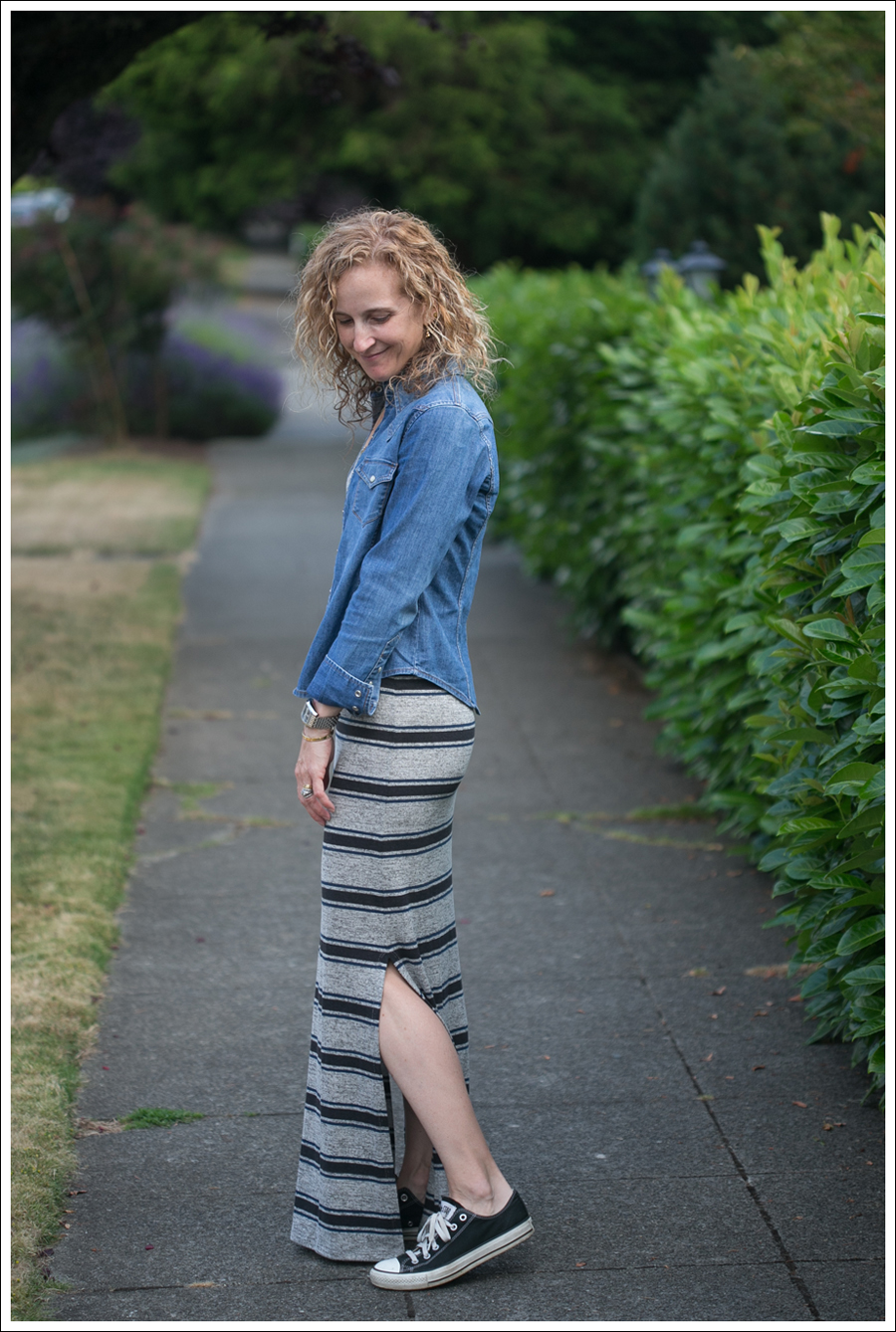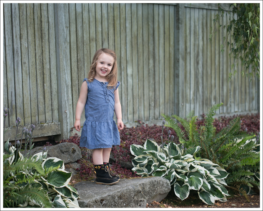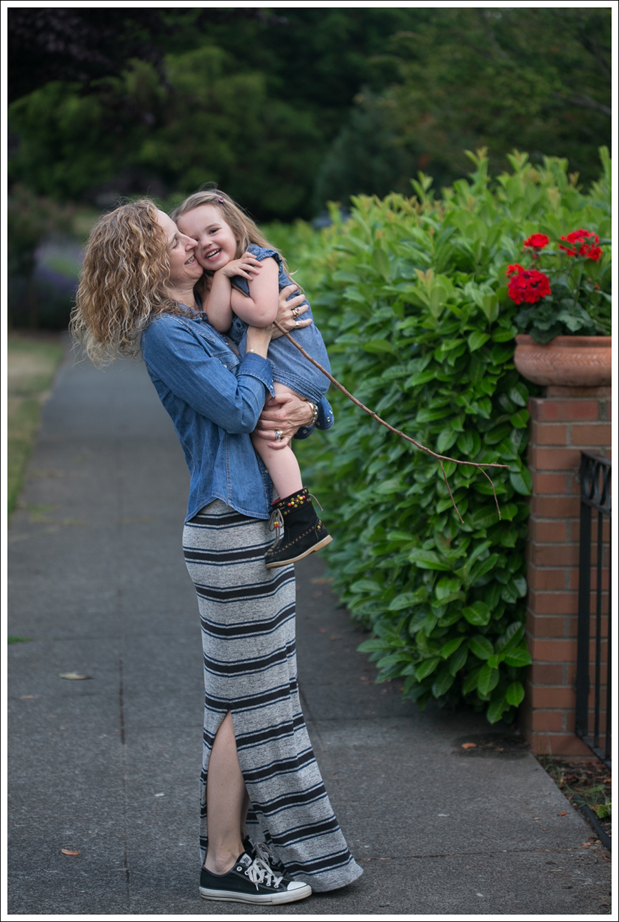 I honestly didn’t even plan on making this an all thrifted outfit for both me and Maya, but chances are…that’s going to happen more often than not 🙂 I’m sure it’s pretty obvious by now that I’m not really a dress person. In my mind, I feel way more comfortable in jeans and a tee, but whenever I actually wear a dress…I love it! The Huz loved this dress the minute I tried it on for him. It’s totally fitted (hence the Huz loving it!), so I threw on a denim shirt to make me feel a little less self conscious. The material is ridiculously soft and comfortable, and I love how the Converse make it more casual. Perfect for our night time walk around the neighborhood…
