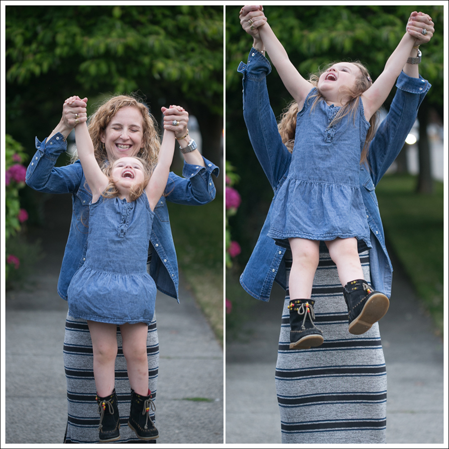 So, Maya asked to “Fly, up in the air?”, which she often does. Bad thing is that she now kicks her feet out and often times clocks me in the face… :{