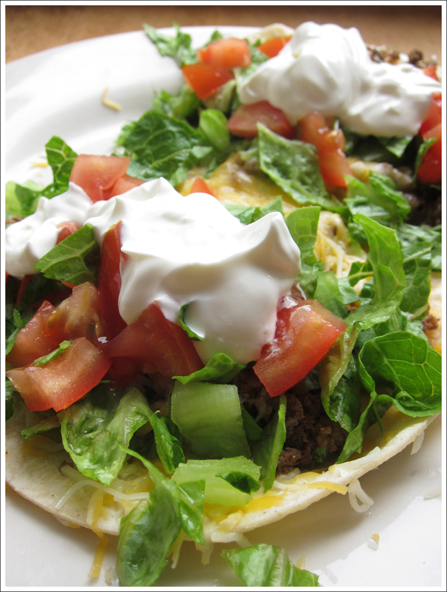 - Warm tortillas and assemble by spooning meat mixture and layering the veggies, cheese and sour cream