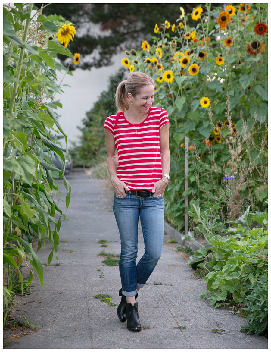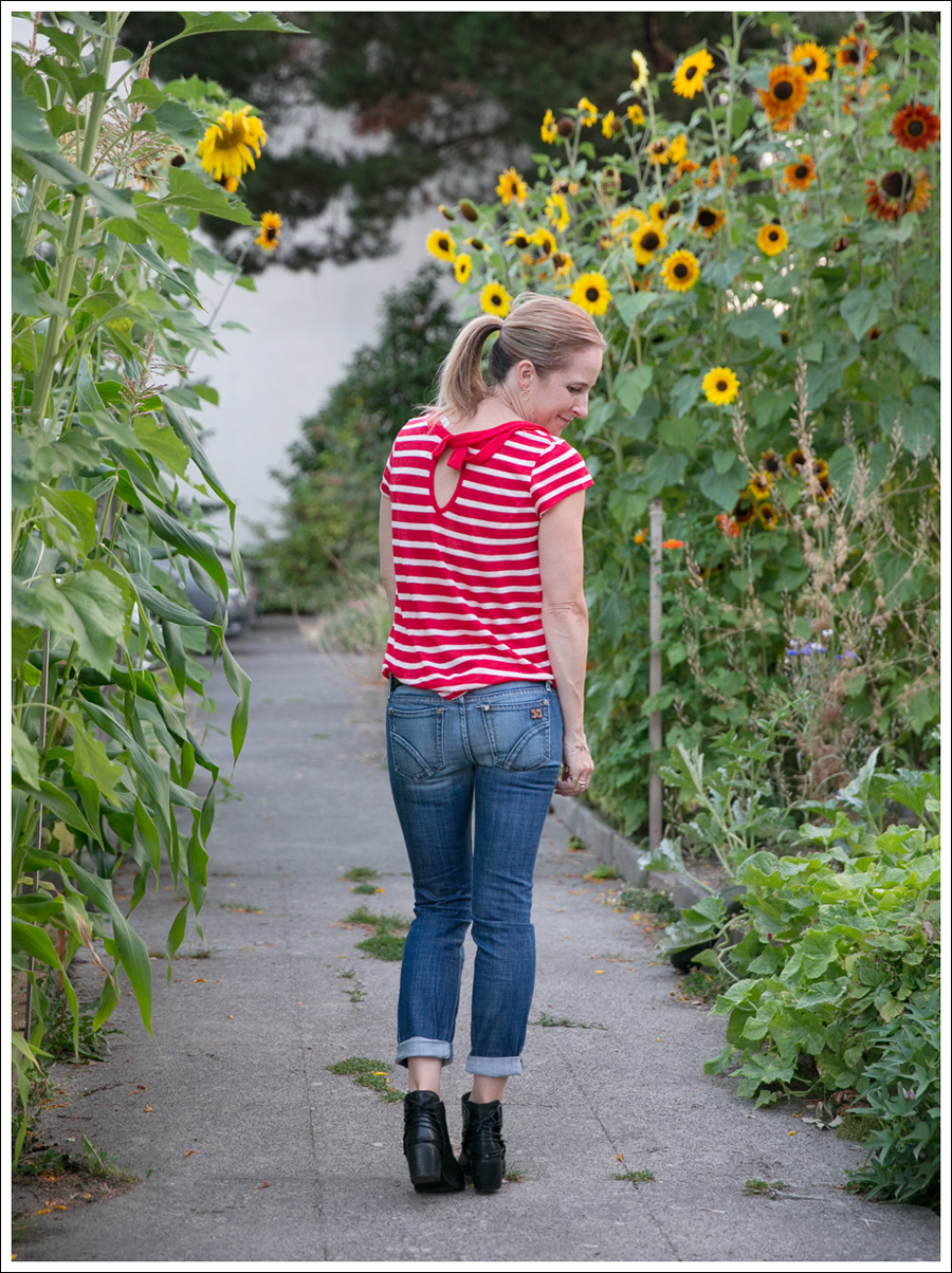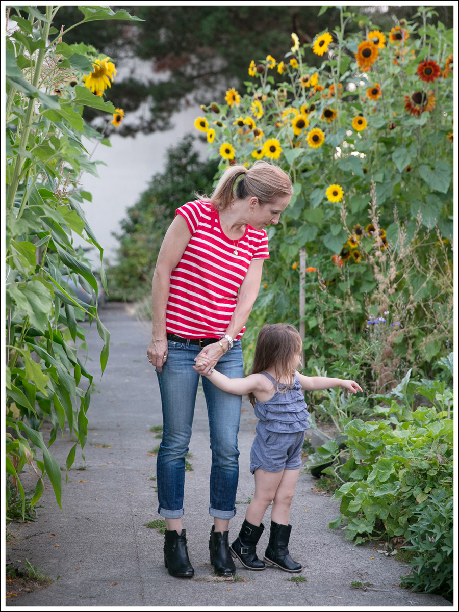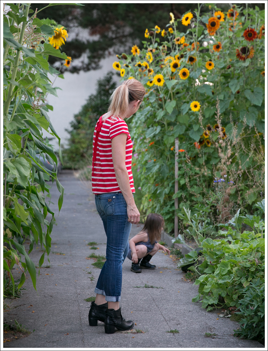 We live in the city, but there’s a house in our neighborhood that always grows large amounts of seasonal things. Maya always comments as we drive by, depending on what’s growing. Right now…it’s large sunflowers. I keep wanting to take pictures by them, and we finally did the other night.