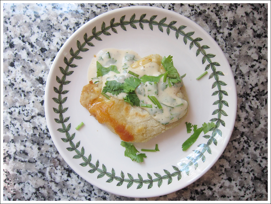 My sister was in Peru recently and brought back this fabulous recipe – Salvadoran Papusas. So easy, so fun! Basically mix finely ground corn meal (called masa harina or masa de maiz) with water, add whatever toppings/stuffings you want (like cheese, herbs, cooked meat, veggies) and fry in a dry pan (no oil). I topped with Cilantro Lime Crema and these were delicious!