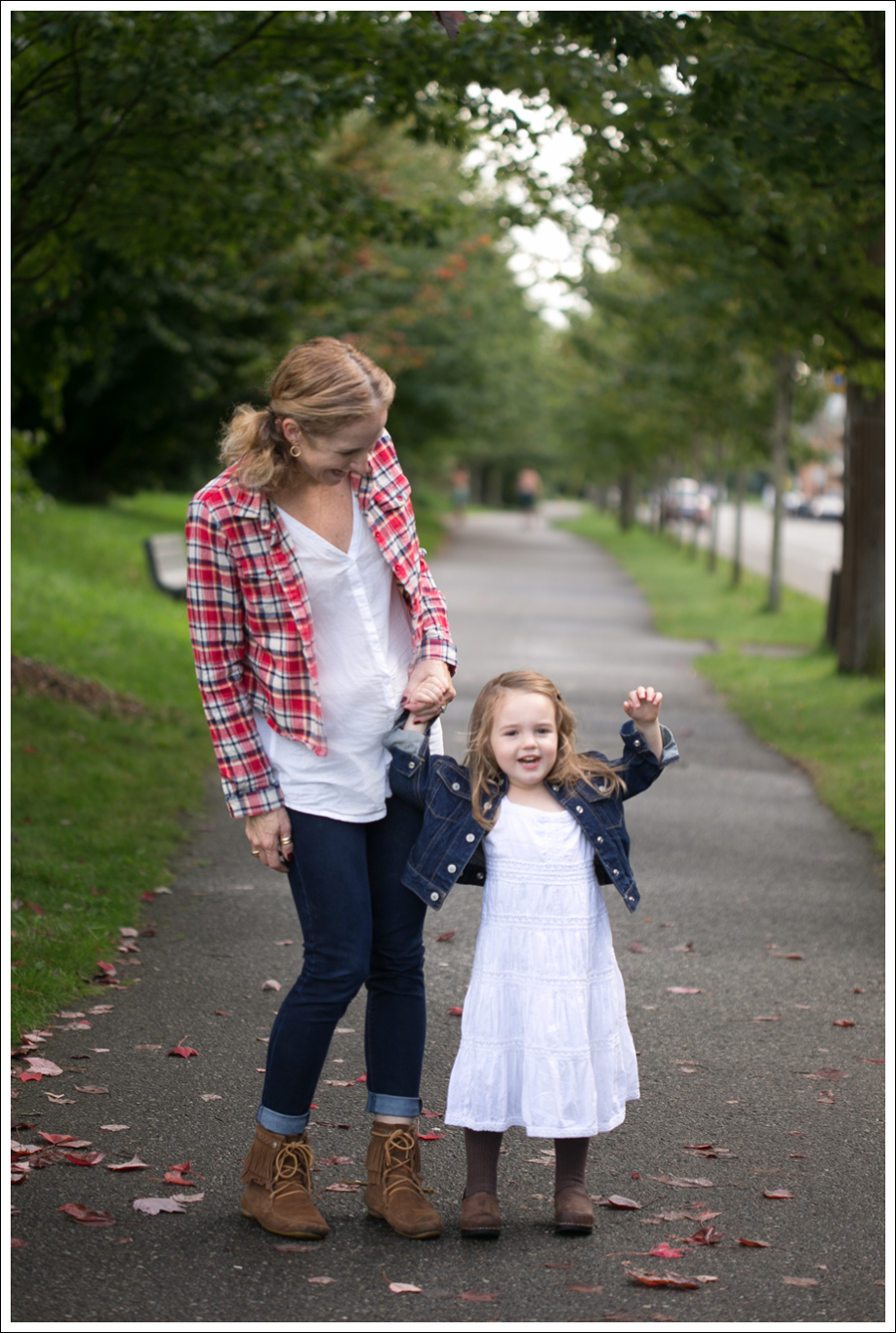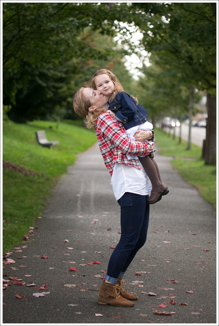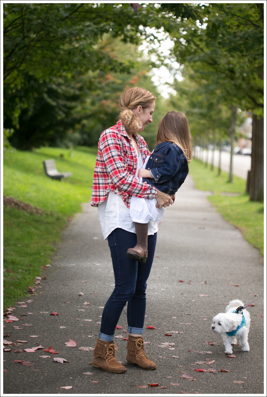 I can’t decide if I look like a cross between a lumberjack and Pocahontas, or…if it just looks comfortably fall like 🙂 Either way, I was so comfortable! Until the sun blared down upon us 15 minutes in. Seriously, I don’t want to complain about sunshine, but the bipolar disorder of the weather right about now is killing me! Cold and bundled up…then 15 minutes later sweating and peeling off the layers? Not cool…