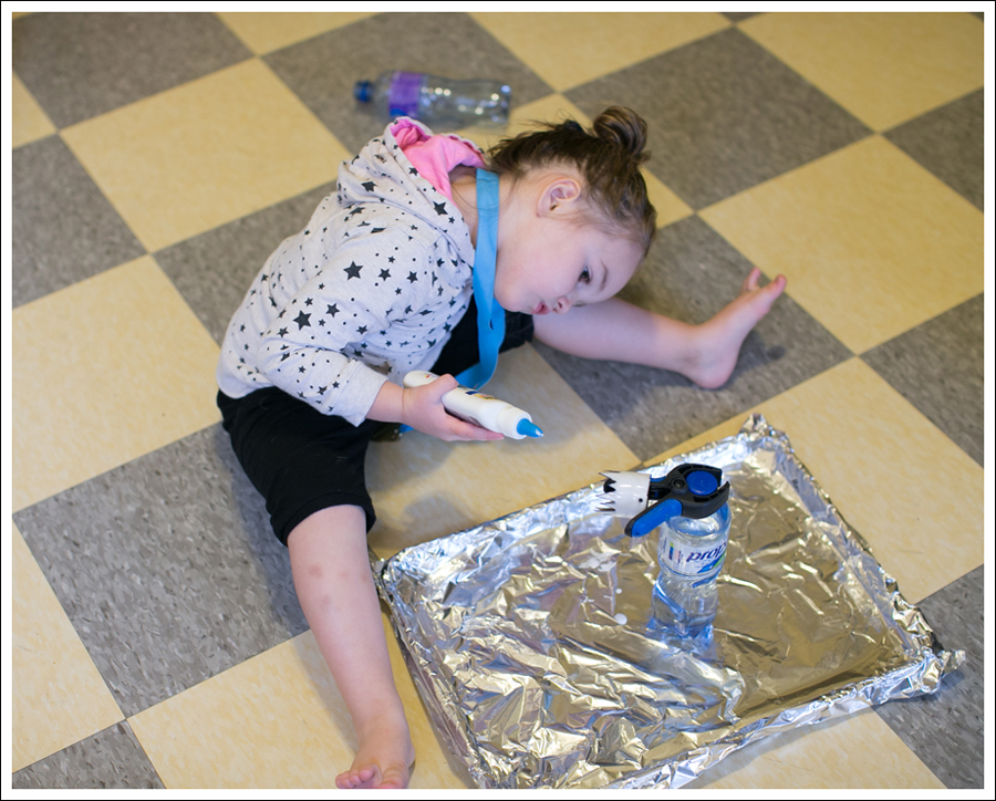 - Have your toddler help with lightly pouring the glitter on. I used both black tiny ball glitter and gold dust glitter.