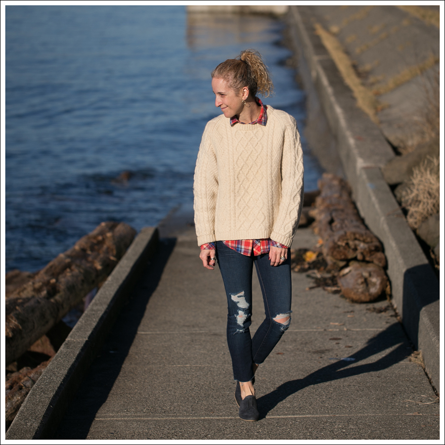 Love a fisherman’s sweater and with the plaid under it, it is perfection!