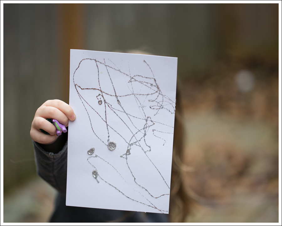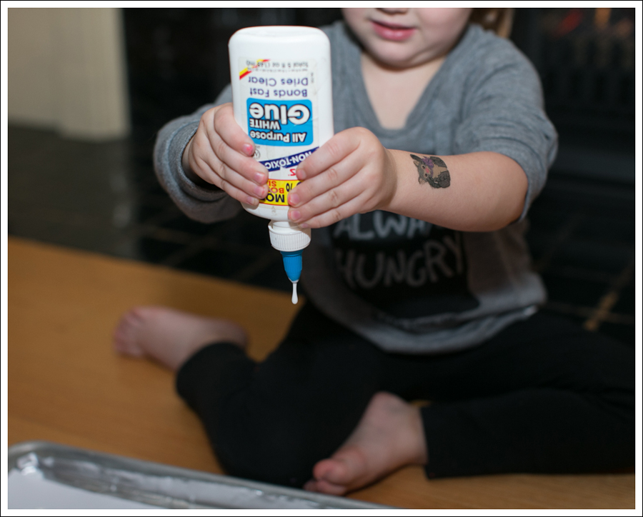 - Let your toddler drizzle the glue all over. I had to rotate the cookie sheet a few times and guide her around so that there wasn’t just a big puddle haha, but she got the hang of it. The best part is that it’s her design!