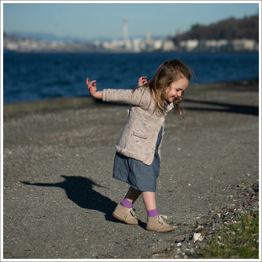 It LOOKS sunny and warm, but…it wasn’t. It was at our house, but when we got down to the water? Not so much. Maya had been in the car next to me eating her snack. When I got her out of the warm car, she had a bit of weather shock!