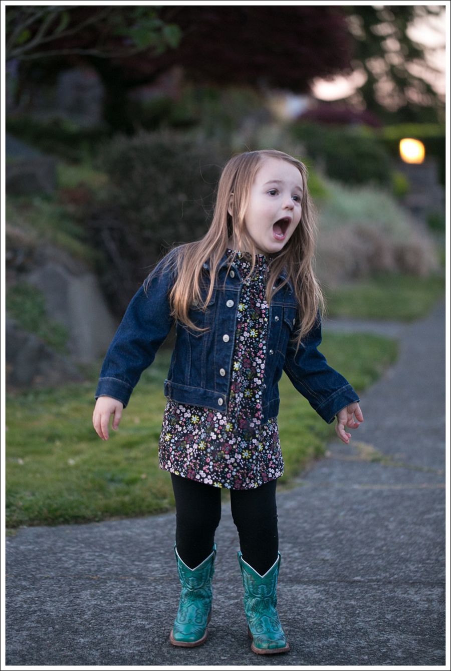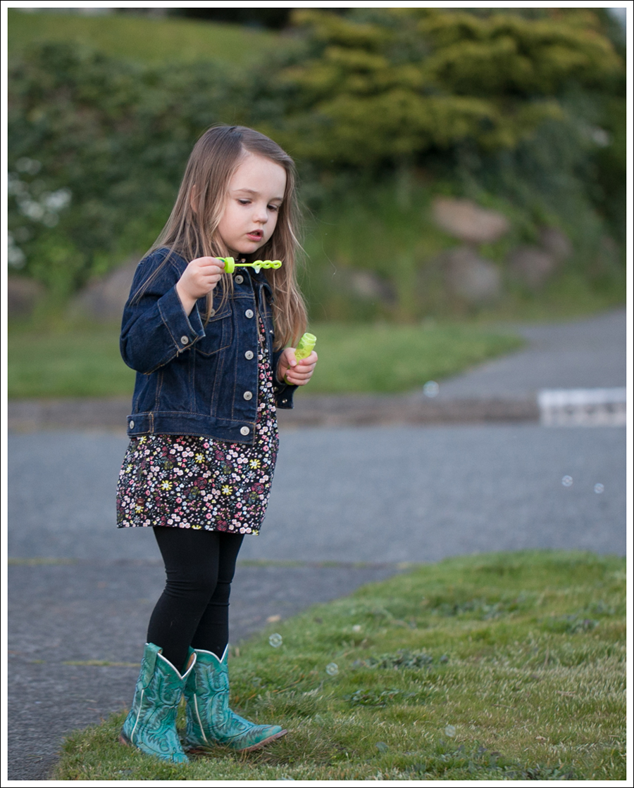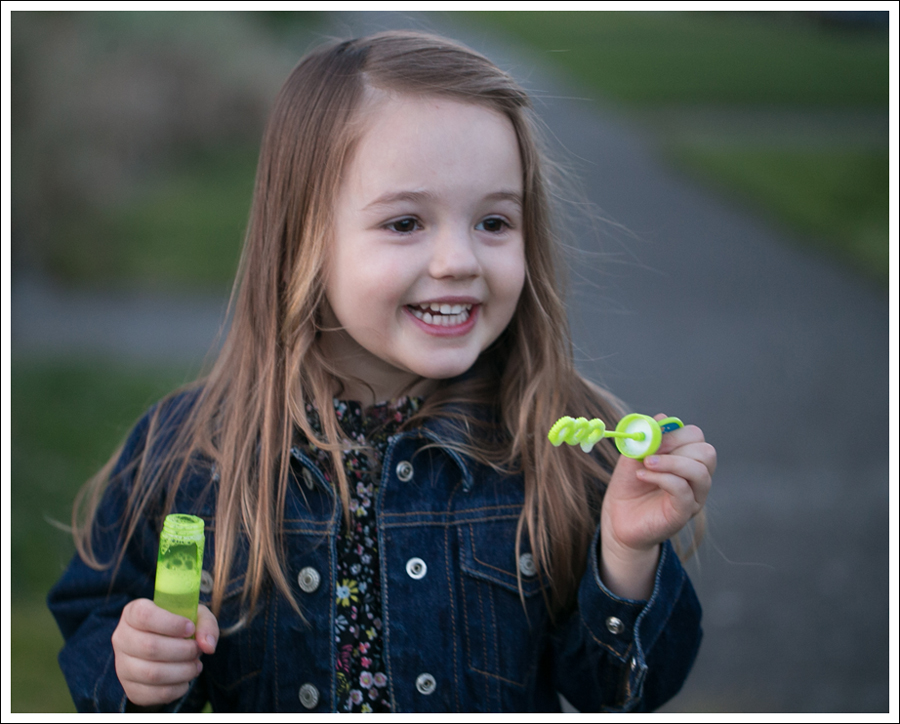 I’m so loving that it’s staying lighter later. It’s especially nice because our weather has been so bipolar lately! One minute we have sunshine, the next it’s raining! You never know when you can go outside and have fun! On this day, it suddenly got nice later, so we ran outside to play with some bubbles.