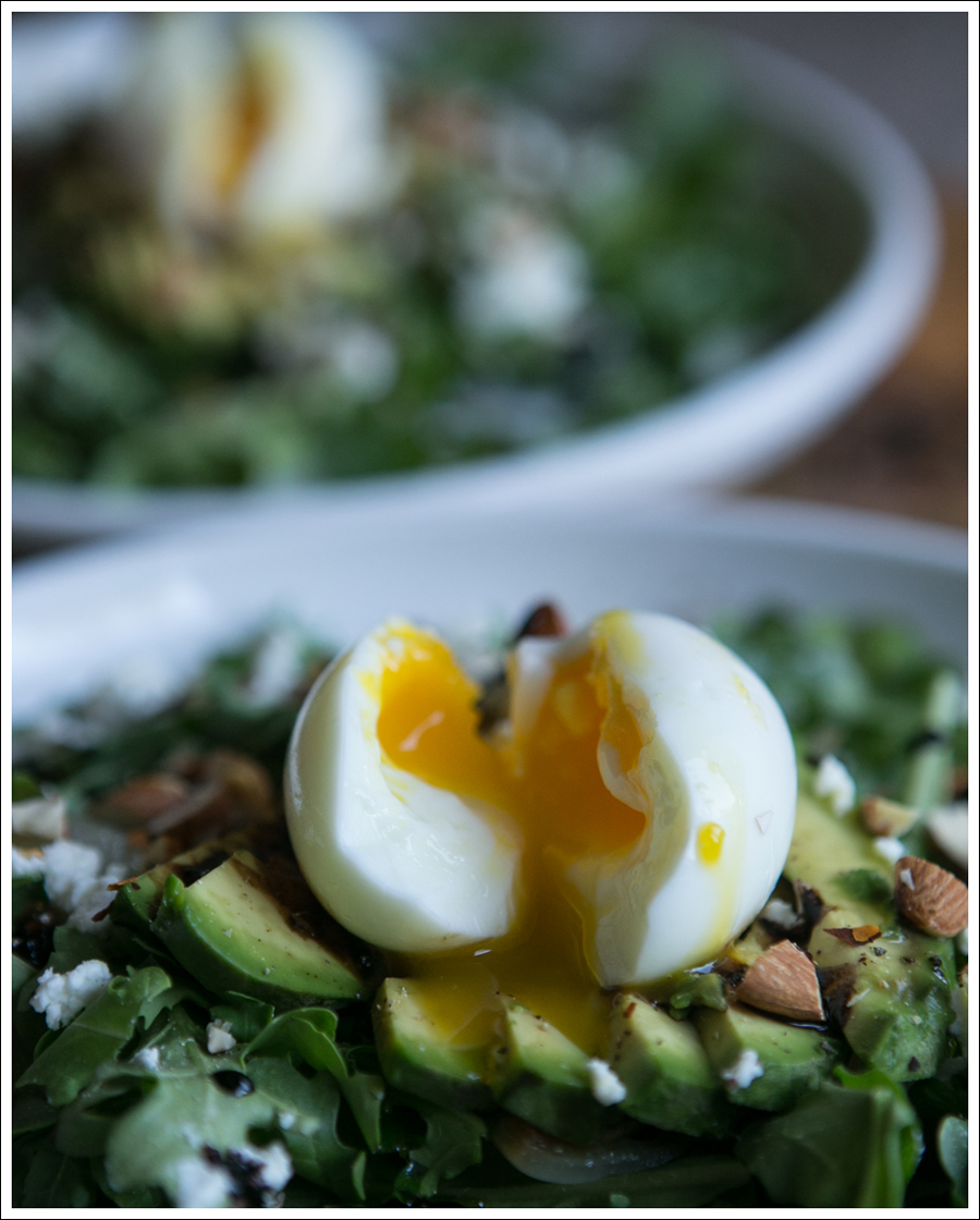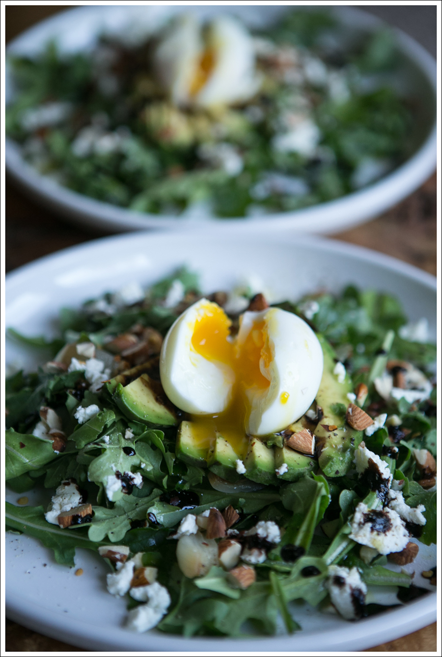 Soft Boiled Egg, Avocado, Almond, and Arugula Salad