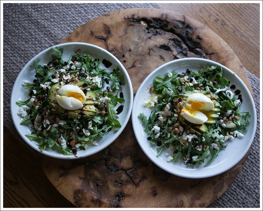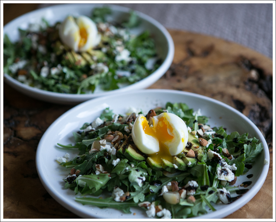 If there’s one thing I’m good at, it’s raiding the kitchen and pulling a meal out of my arse 🙂  That’s exactly what I did on Saturday, and it was delicious.  Although, adding a soft boiled egg to just about anything makes it delicious in my book!Blog Soft Boiled Egg Avocado Arugalo Goat Cheese Almond Salad-1Ingredients (serves 4)