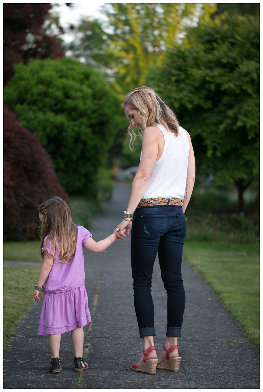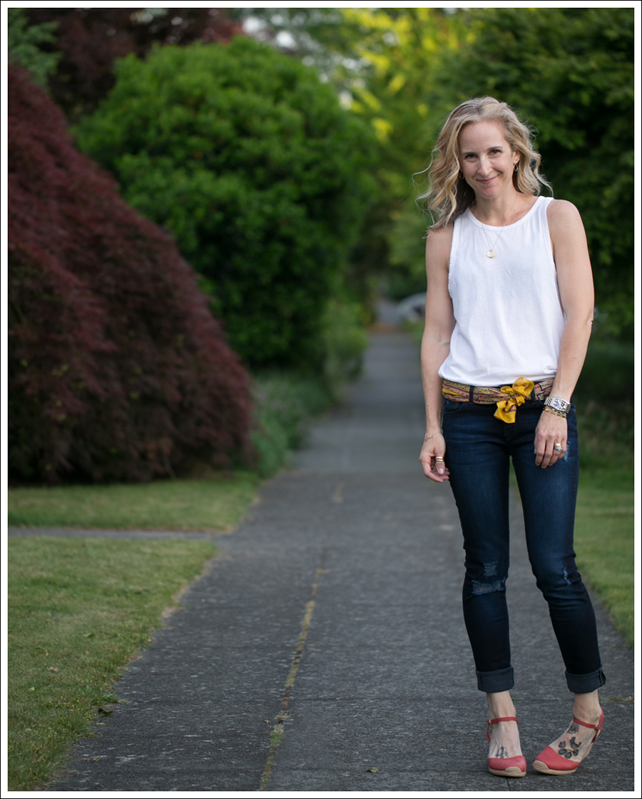 For $9, I took this relatively simple and casual outfit, and dressed it up ($4 for the vintage silk scarf, and $5 for the sandals). I scored this super cute vintage silk scarf while I was on my girls trip. I keep wanting to figure out how to wear it in my hair, and a) have it stay put b) not look like I’m totally trying too hard. So far, I haven’t succeeded in either of those, so…instead I wore it as a belt! 🙂