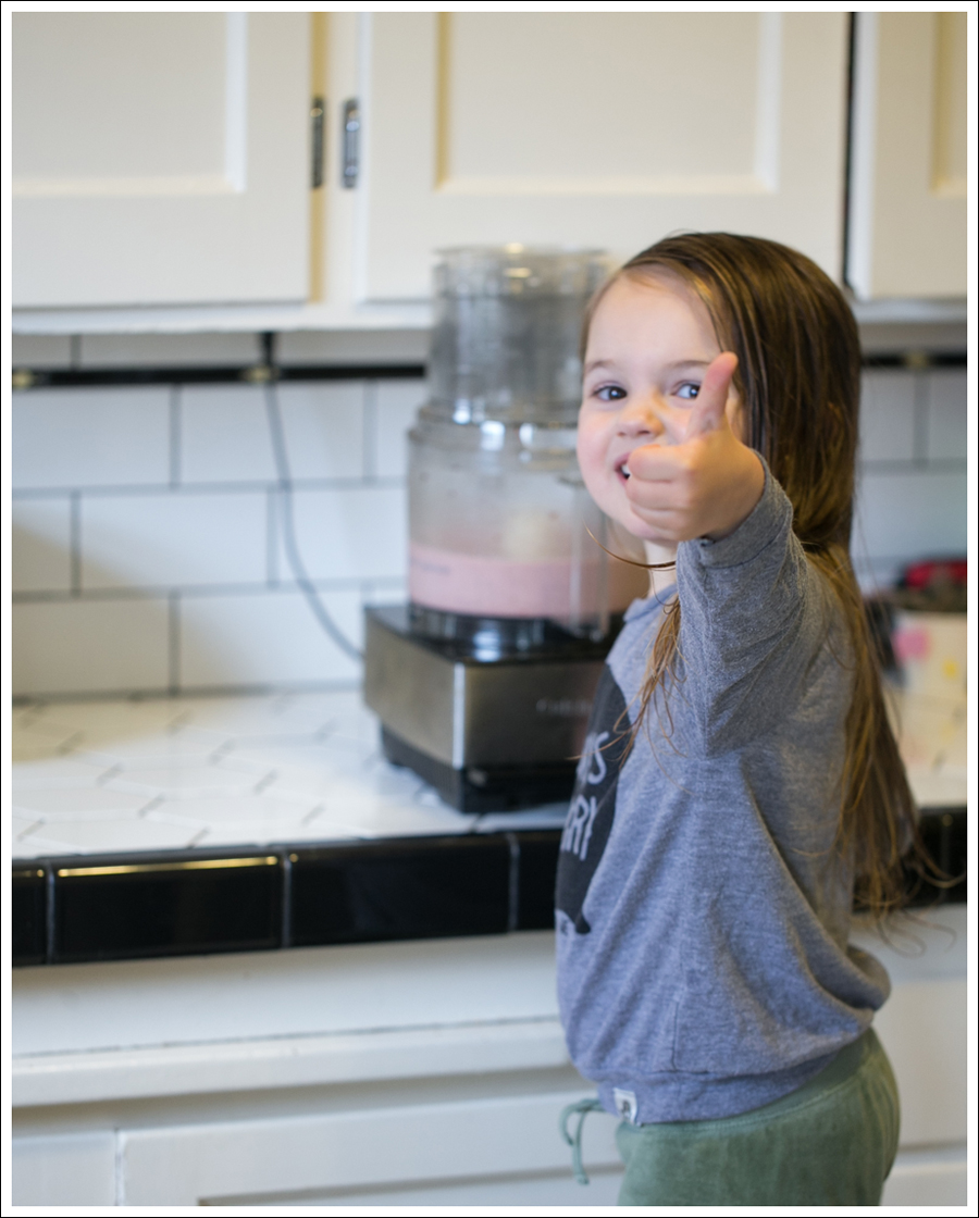 Put frozen bananas, frozen cherries, almond milk, and inside of vanilla bean in a Cuisinart, or blender and pulse until it looks like this (you might have to stop and stir occasionally. Also, might need to add more Almond Milk depending on the size of your bananas.