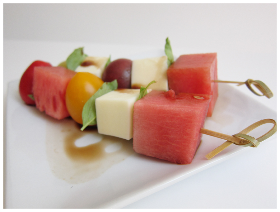 You skewer cherry tomatoes, cubed mozzarella, cubed watermelon and fresh basil leaves. Then drizzle with your favorite balsamic vinaigrette and serve! So easy!