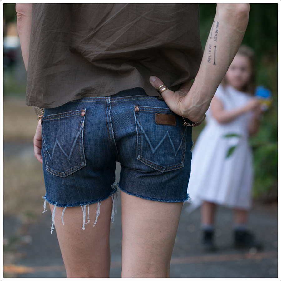 Oh, hey-there’s my ASS! 😉 Never in a million years would I have thought I would post a picture of my butt. BUT, really…I never would have thought I’d post a pictures of me PERIOD! The beauty of the anonymity of this blog 🙂 All that said, I had to show a close up of these jeans. I found these Wrangler jeans while thrifting, and they are SO COMFY! I think most people (me included!) think of Wranglers as being cowboy/cowgirl jeans. Well, like Levi’s, there’s a reason they started with people that needed to work and move in their denim. And…the Huz liked them on me, so… 🙂