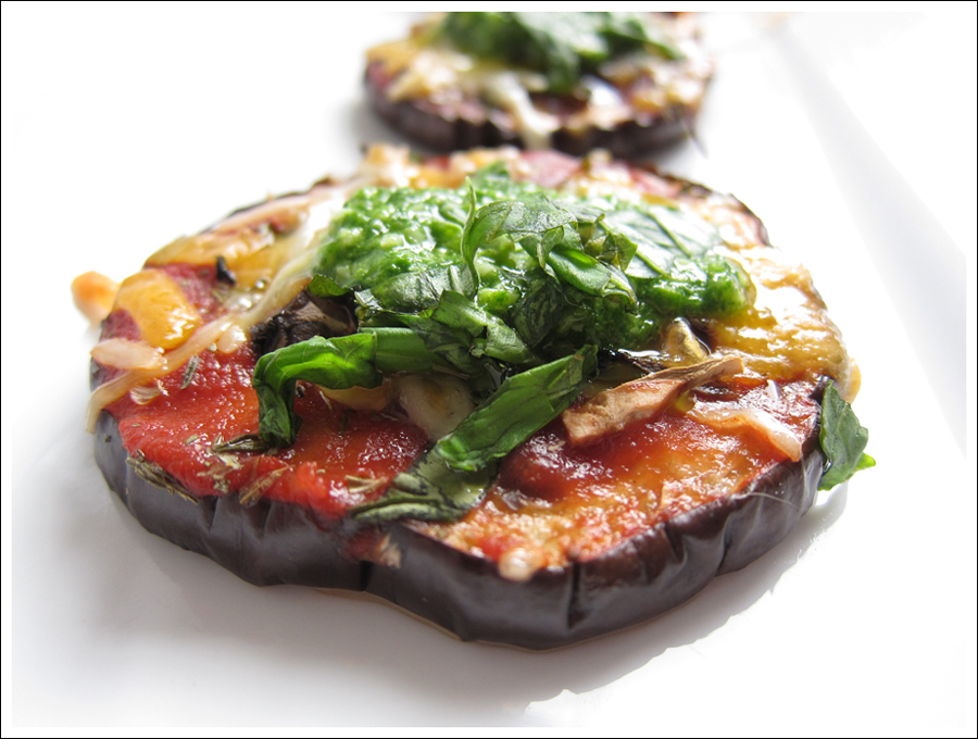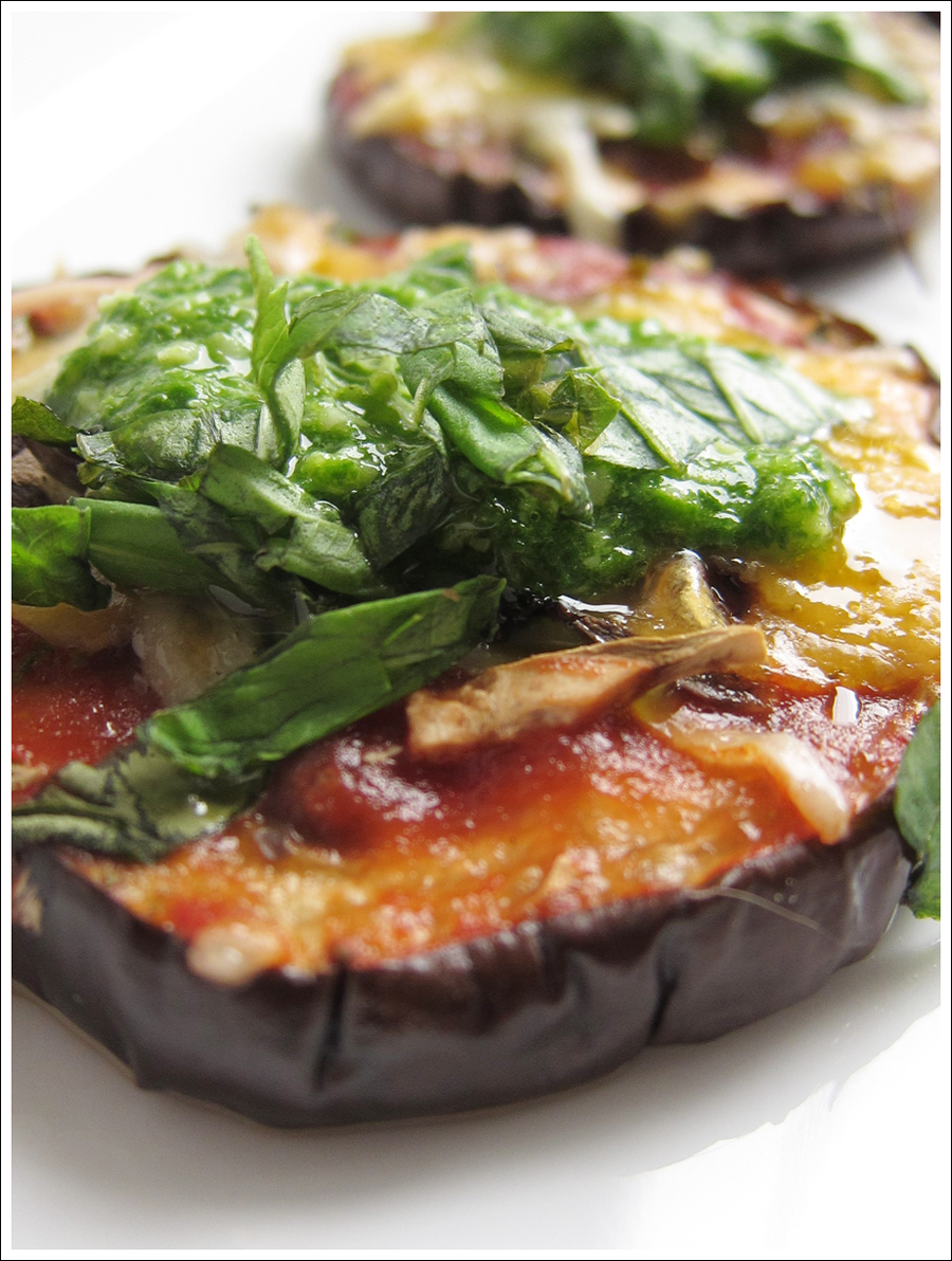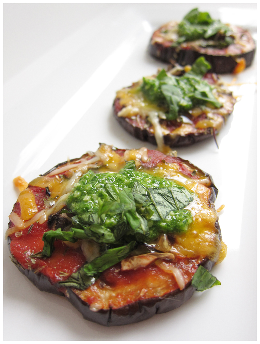 These delicious mini pizzas are made with a base of eggplant and topped with sauce, veggies, cheese and fresh basil. I added some fresh pesto as well and these were delicious! 🙂 Gluten free and grain free and almost paleo (omit cheese for paleo) these are a great alternative to traditional pizza! 🙂