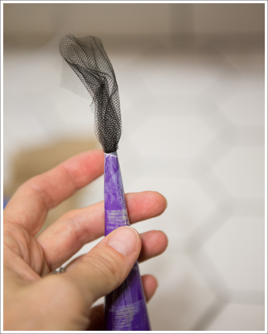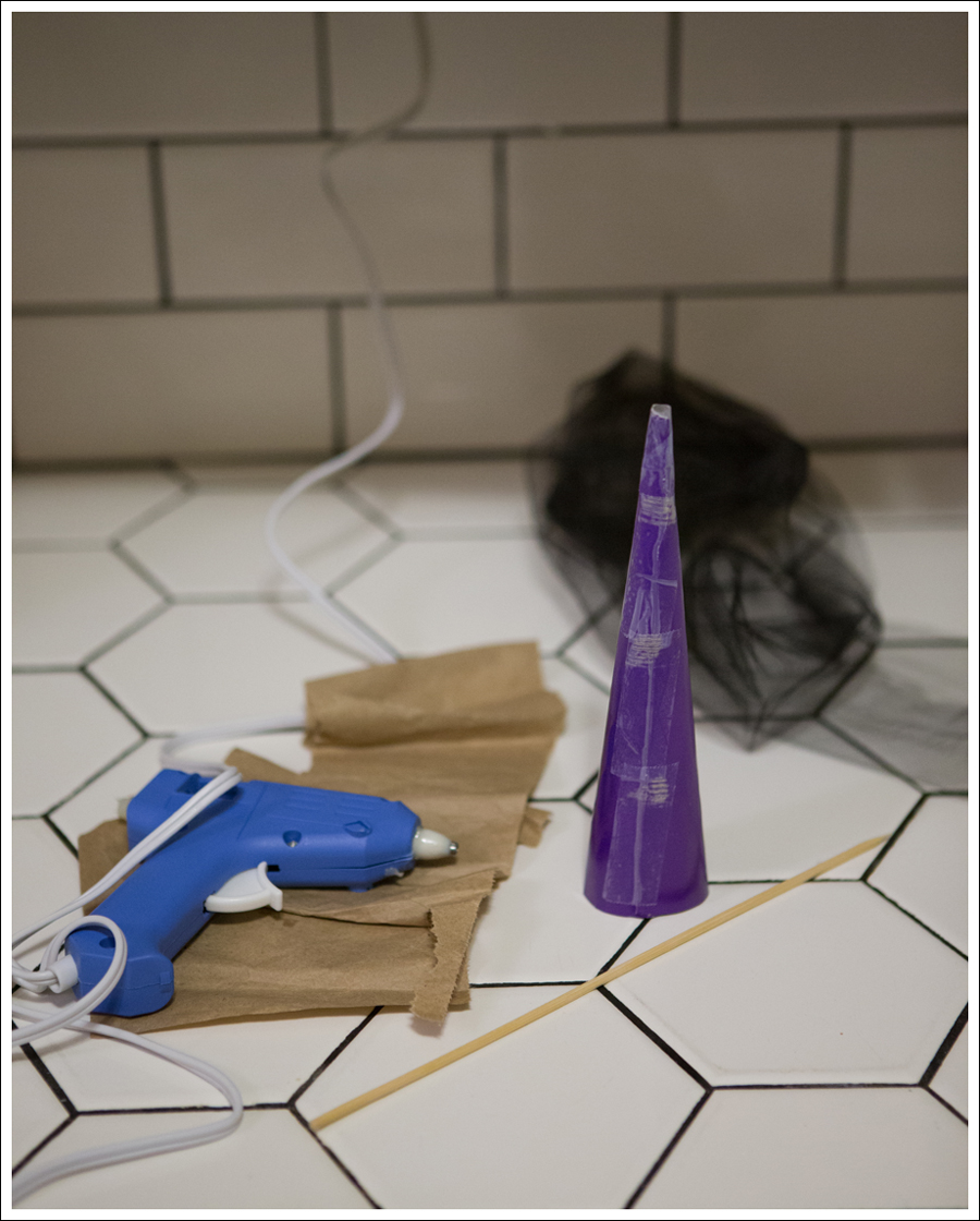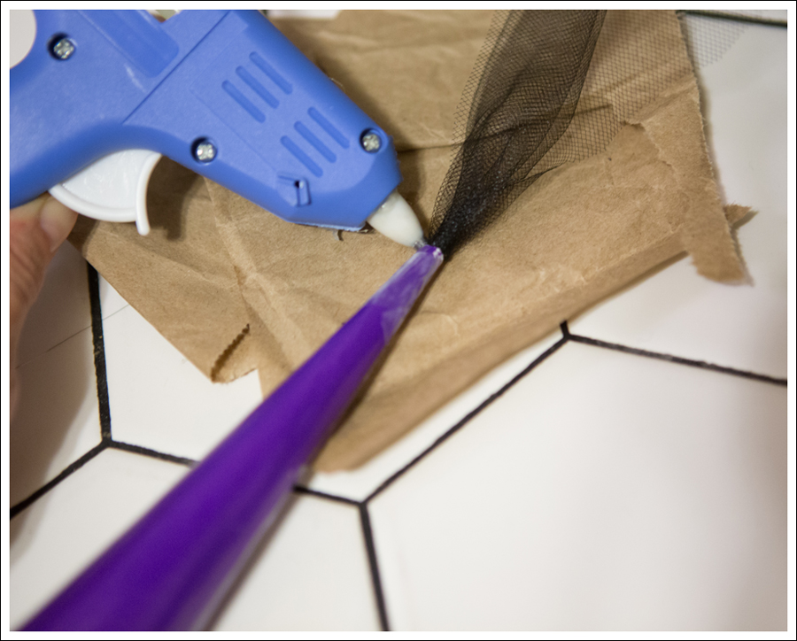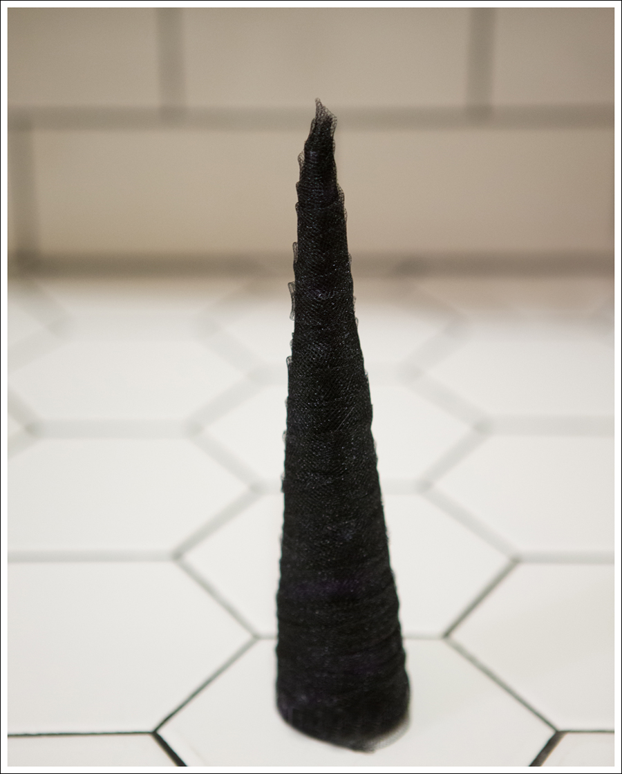 Then keep glue gunning about an inch at a time and wrap the tulle around the horn until you get to the bottom. Then tuck the end under and glue in place.