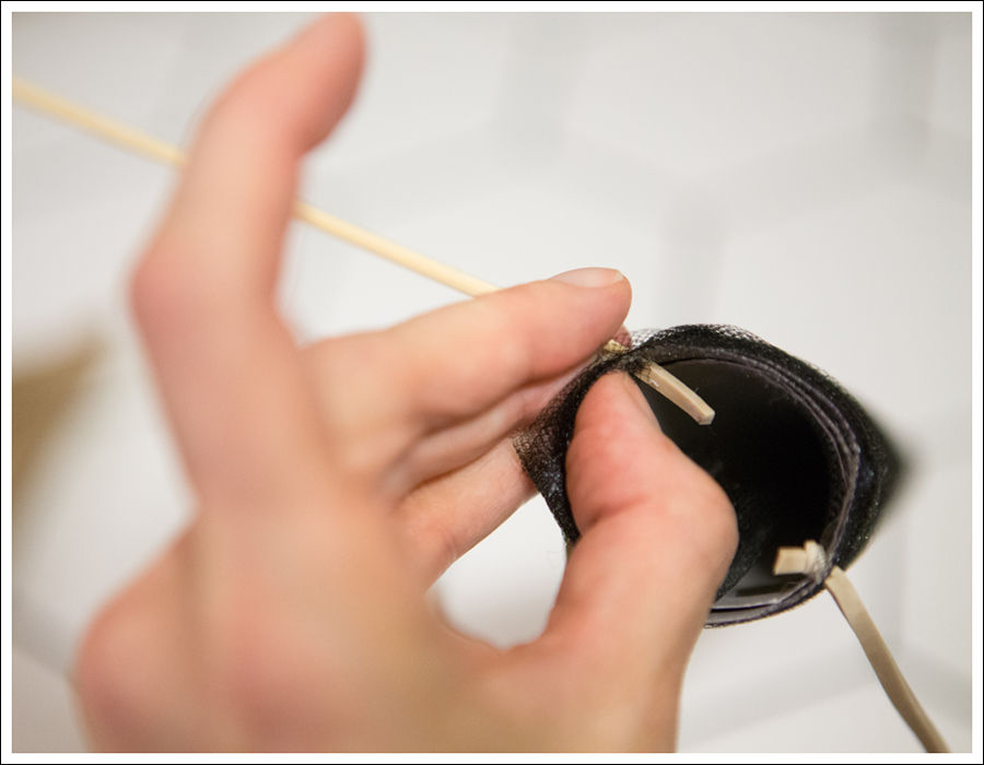 Do two hole punches and thread your elastic into one. Tie a knot, and then thread the other end through. Make sure you put the horn on whoever is going to wear it and make sure it’s not too tight or too loose before you tie off the other end. You want it to stay on, but not hurt. I actually used a extra large rubber band at first (shown below), but it was too tight on Maya’s head. So, I used a black piece of elastic that was a lot longer than I had originally planned, measured it on her head, and it was perfect.