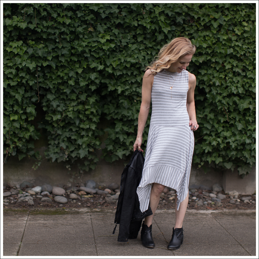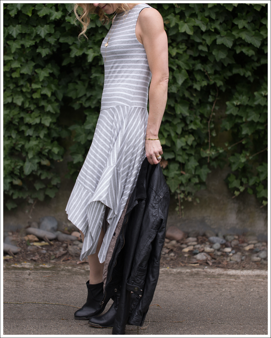 Very cool outfit! I love the pairing of a casual dress, booties, and leather jacket!