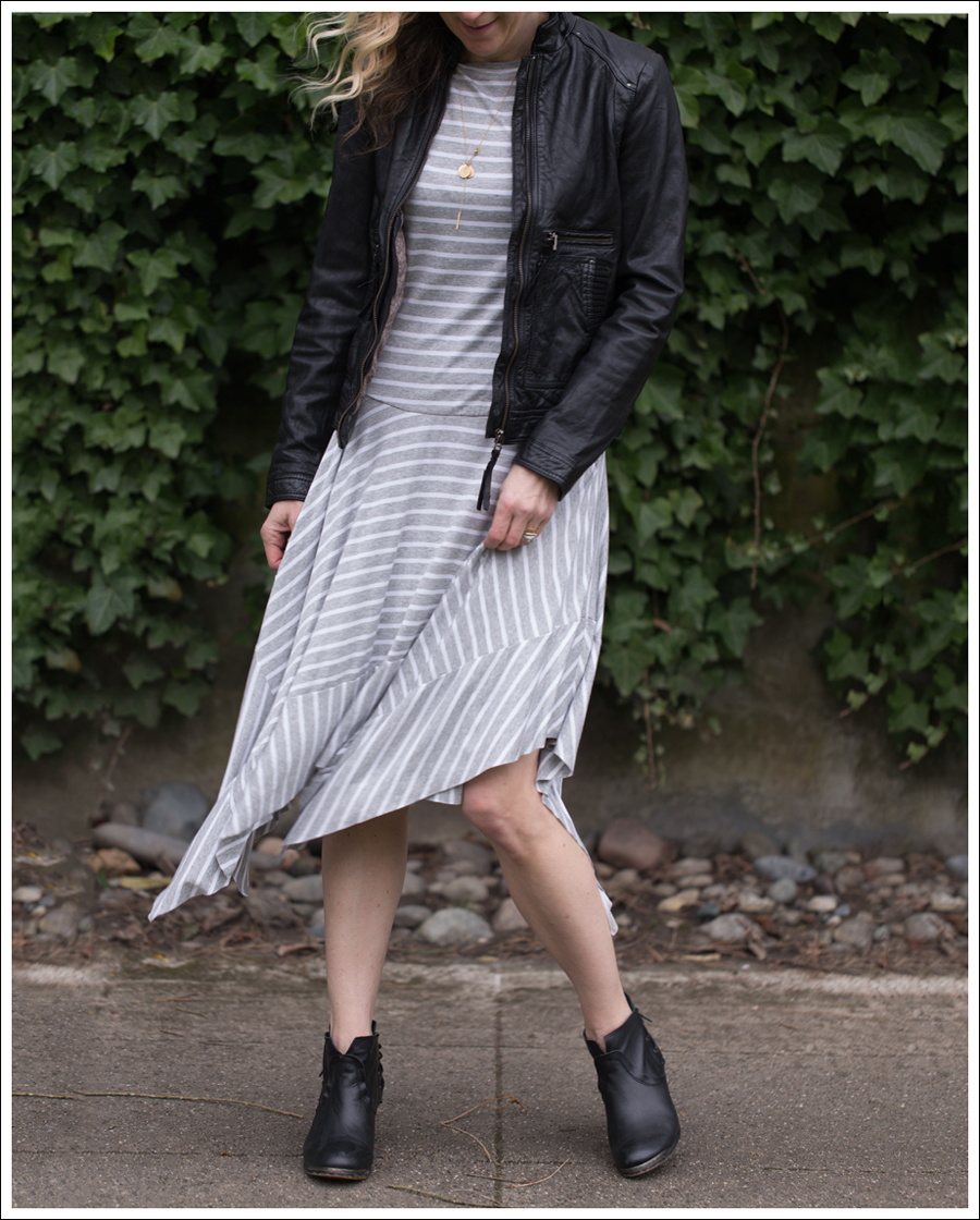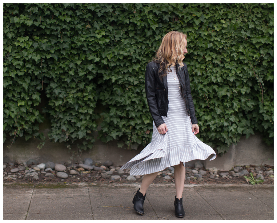 Very cool outfit! I love the pairing of a casual dress, booties, and leather jacket!