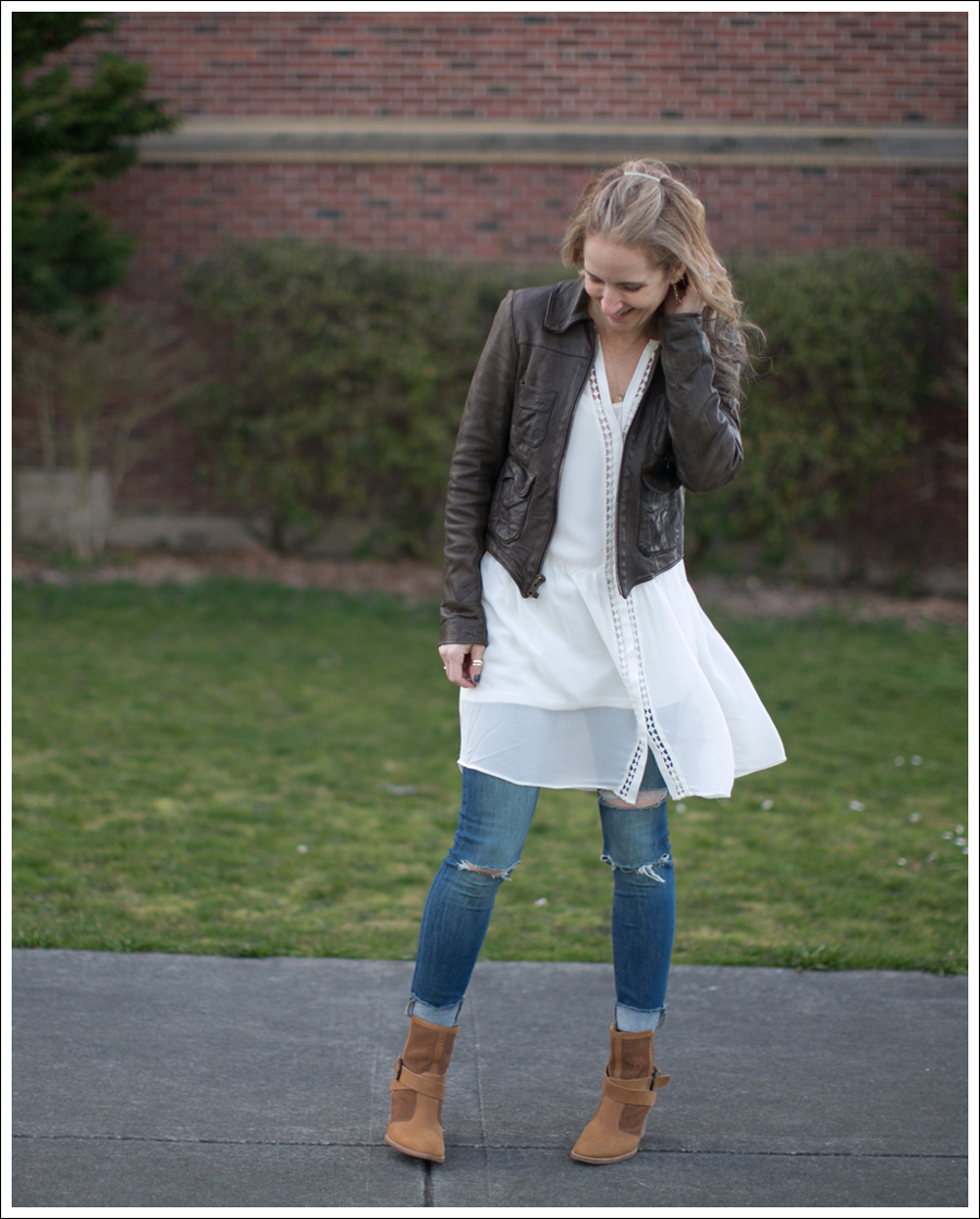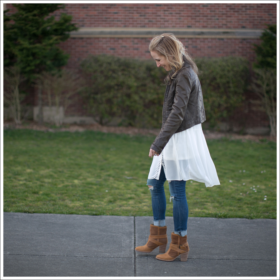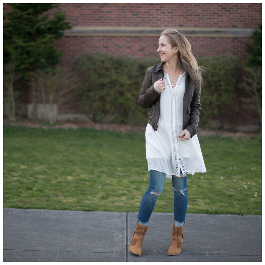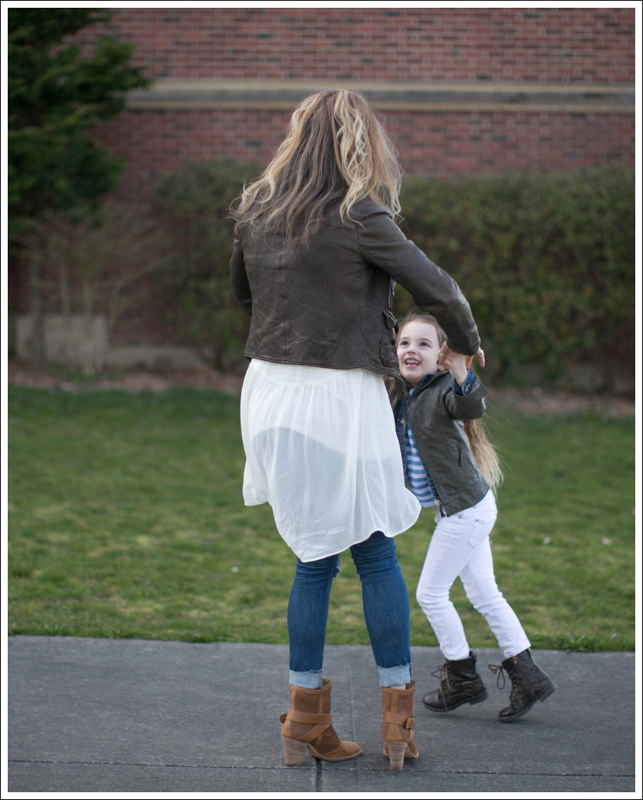 I wore this dress before and took it from day and then to night. What I hadn’t realized when I tried it on was that the slip that came with it was SO SHORT!! I added a 2nd slip when I wore it alone as a dress, but decided it would be perfect over a pair of skinny jeans! I love putting skinnies over dresses that are a liiiiiittle too short for…well, ANY kind of movement. Especially the case when you are dealing with your kids! Running after them? Bending over?!! Um…not happening!