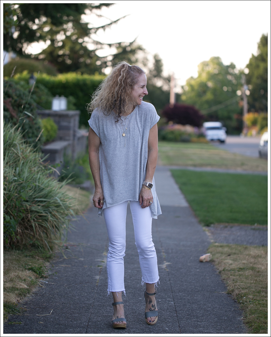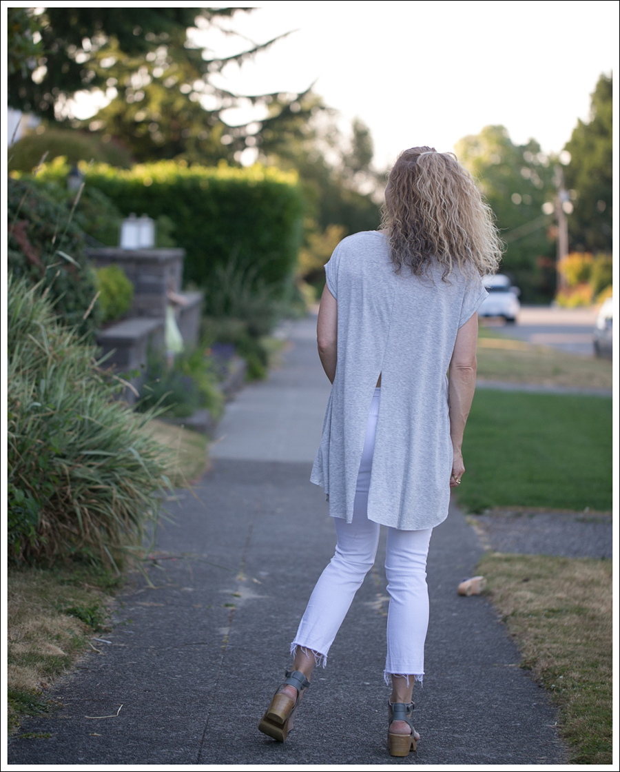 Gray Split Back Tee + White Raw Hem Skinnies + Ankle Wrap Clogs!