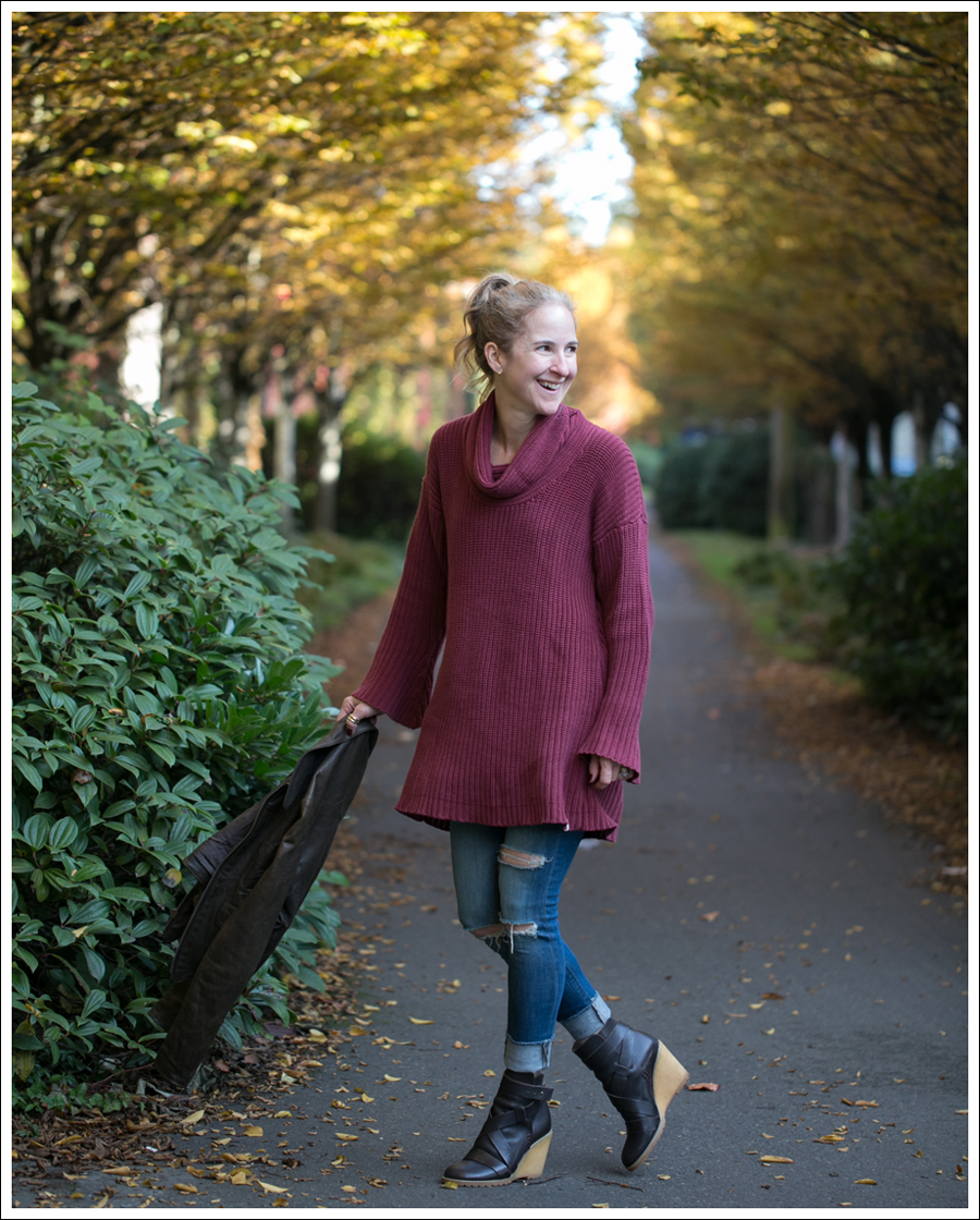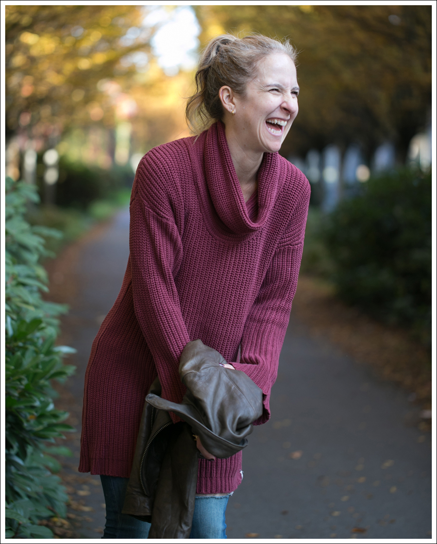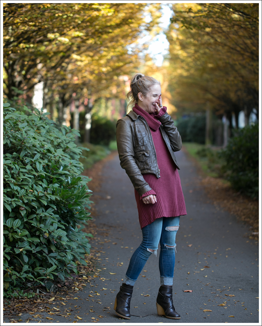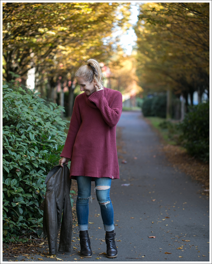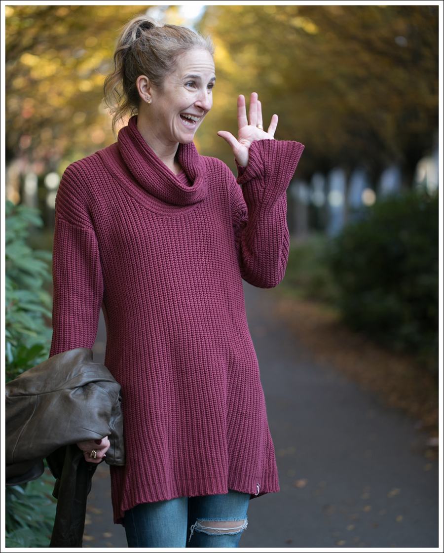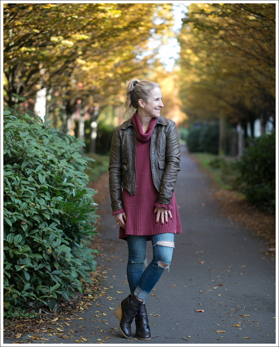 The easiest for me is to swap out the tennis shoes for a fun bootie and throw on a leather jacket. I swear it can take a tee shirt and jeans to another level! Or in this case…a chunky knit and jeans!