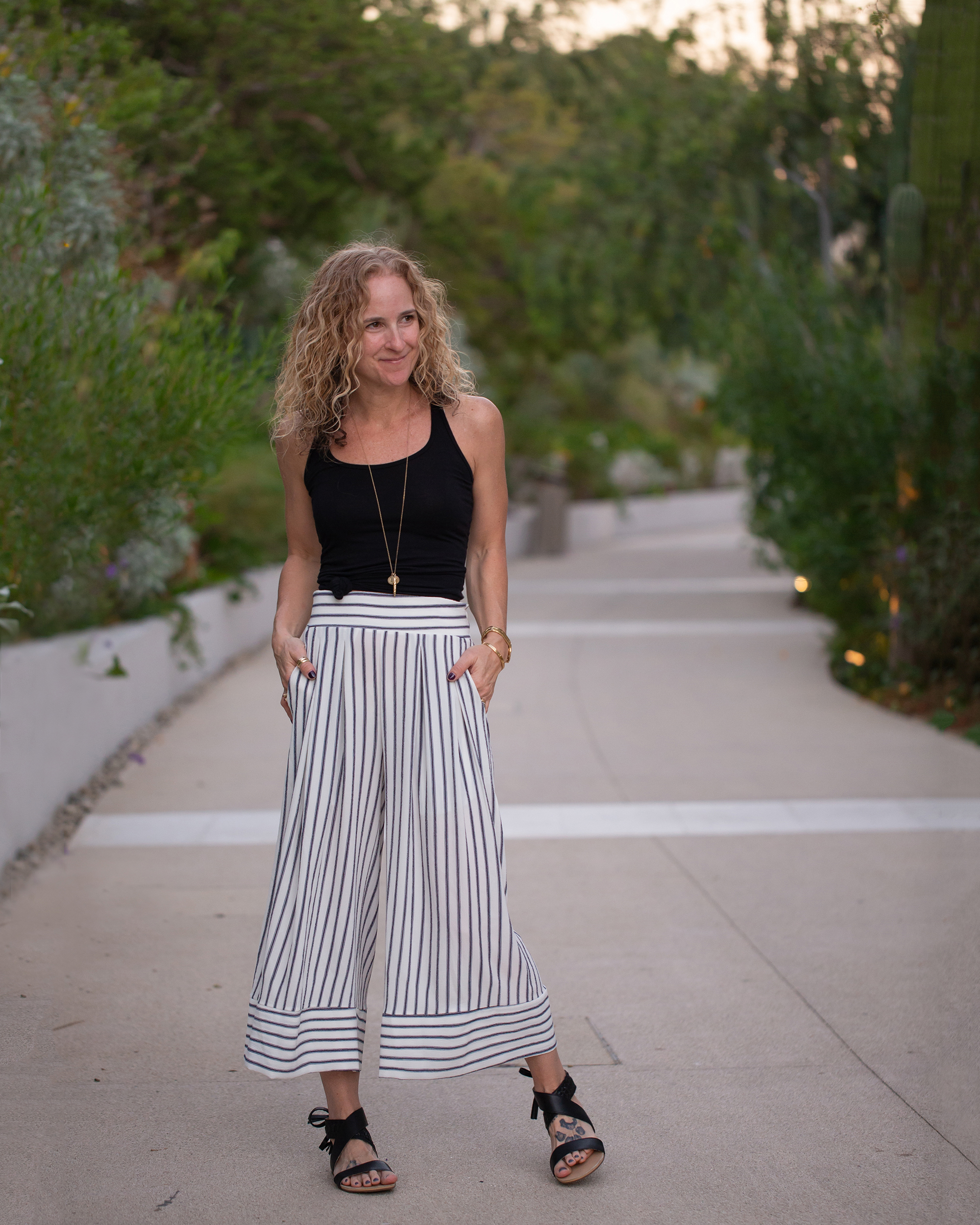 Tank + High Waisted striped Palozzo Pants + Tied Sandals