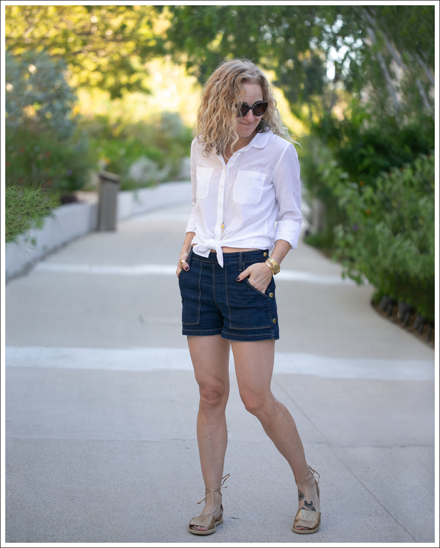 White Tied Button Down + High Waisted Dark Denim Shorts + Gold Wrap Sandals