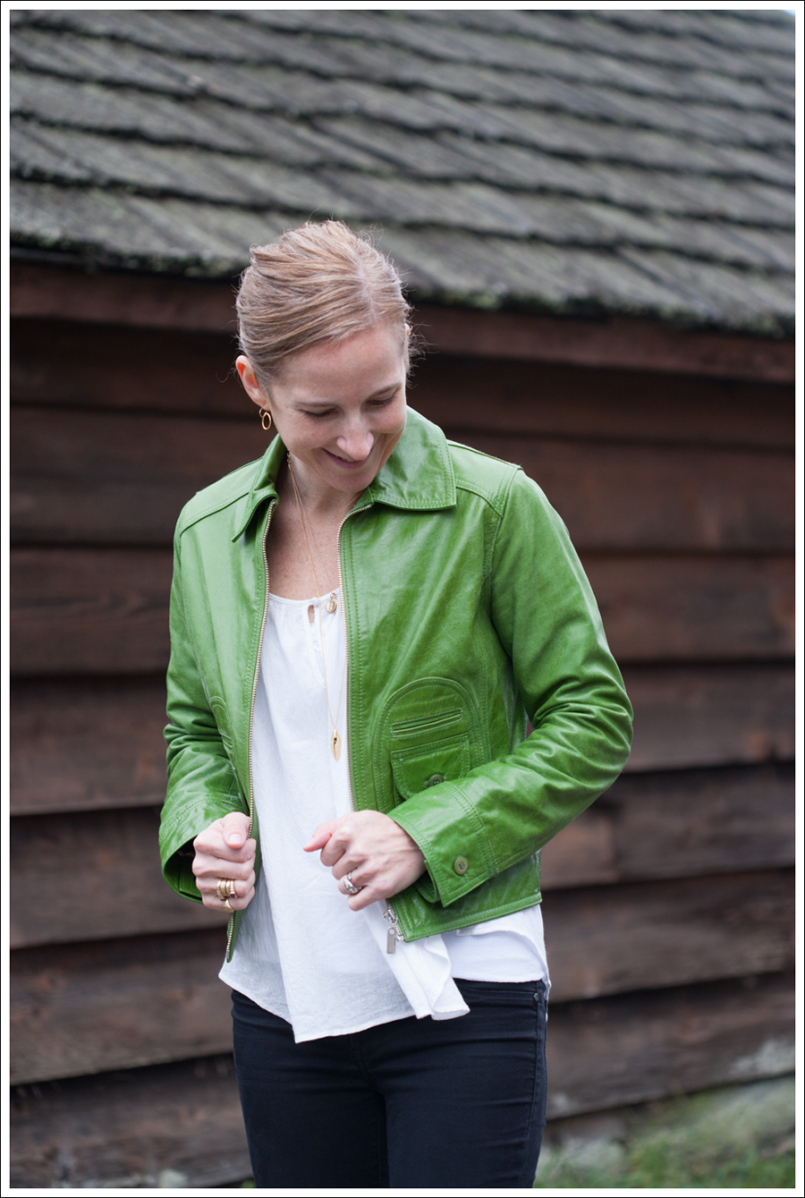 I got this vintage leather jacket at Funky Janes for $25!! I LOVE IT! It totally looks like a $500 jacket, yet I know that nobody else is wearing it 🙂