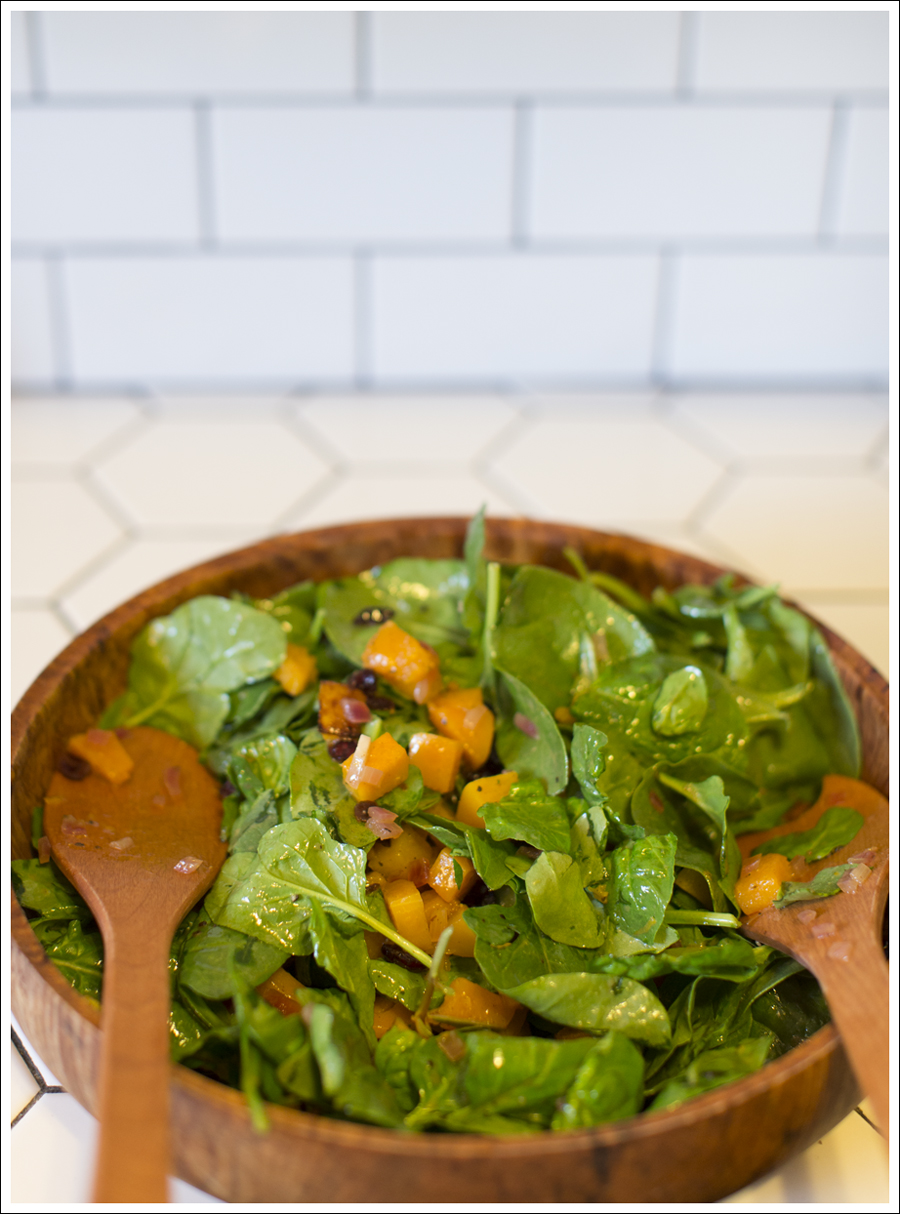 - Place salad greens in a large bowl. Toss in butternut squash mixture and dressing. Pepper to taste.