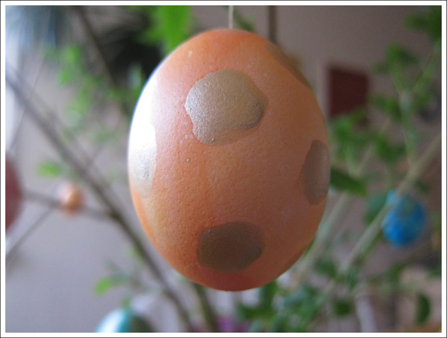 While the eggs dry, fasten a piece of sewing thread to a small stick (e.g. broken toothpick or bamboo skewer), drop this into the egg so that the stick flips to the horizontal and becomes an ‘anchor’ from which the string is attached. Now the egg is ready to be decorated further and/or hung. Ave put colored feathers into each egg and was in charge of hanging. And yes, every step of the way there is risk of the eggshells breaking – they are eggshells after all – but make a bunch and have fun!