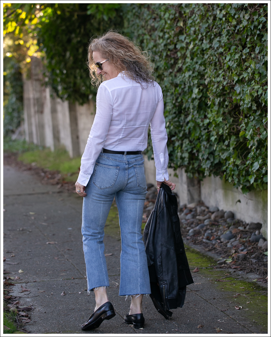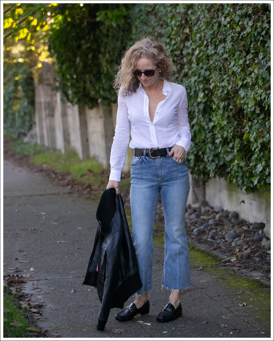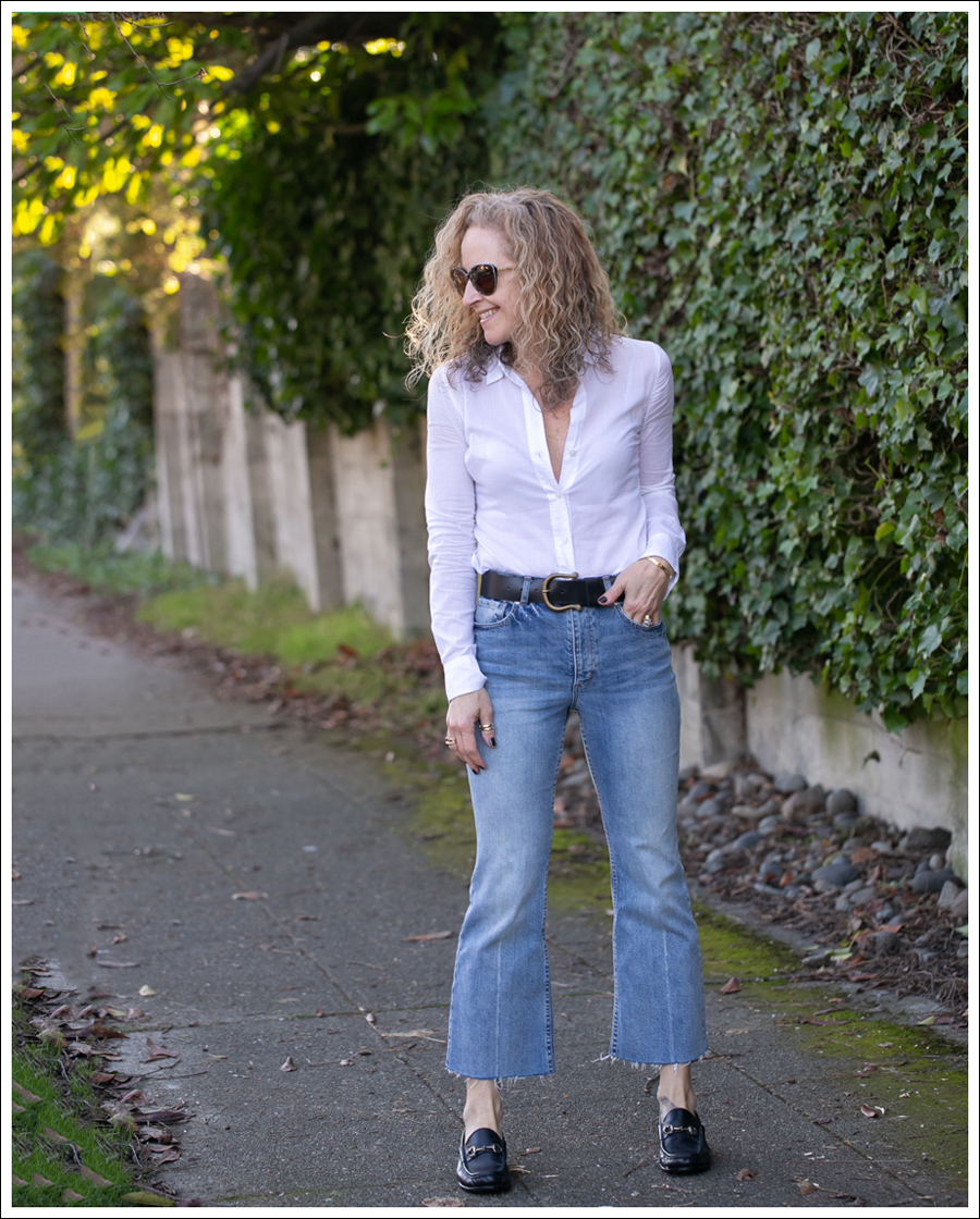 White Button Down + High Waisted Crops + Horseshoe Loafers