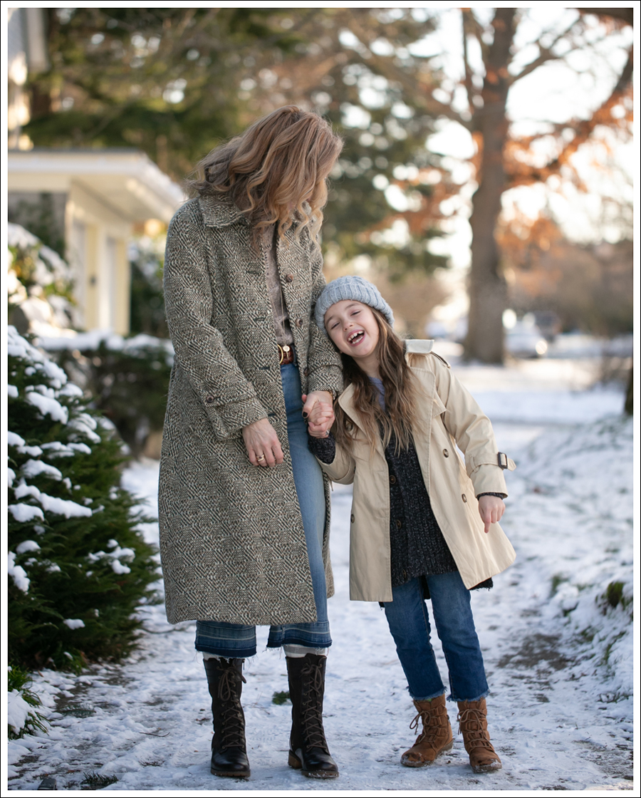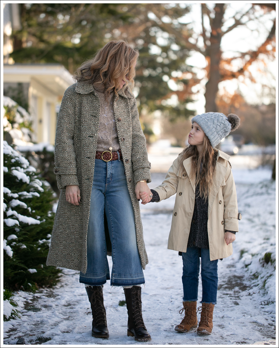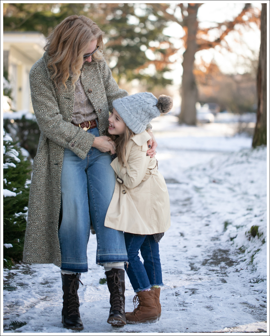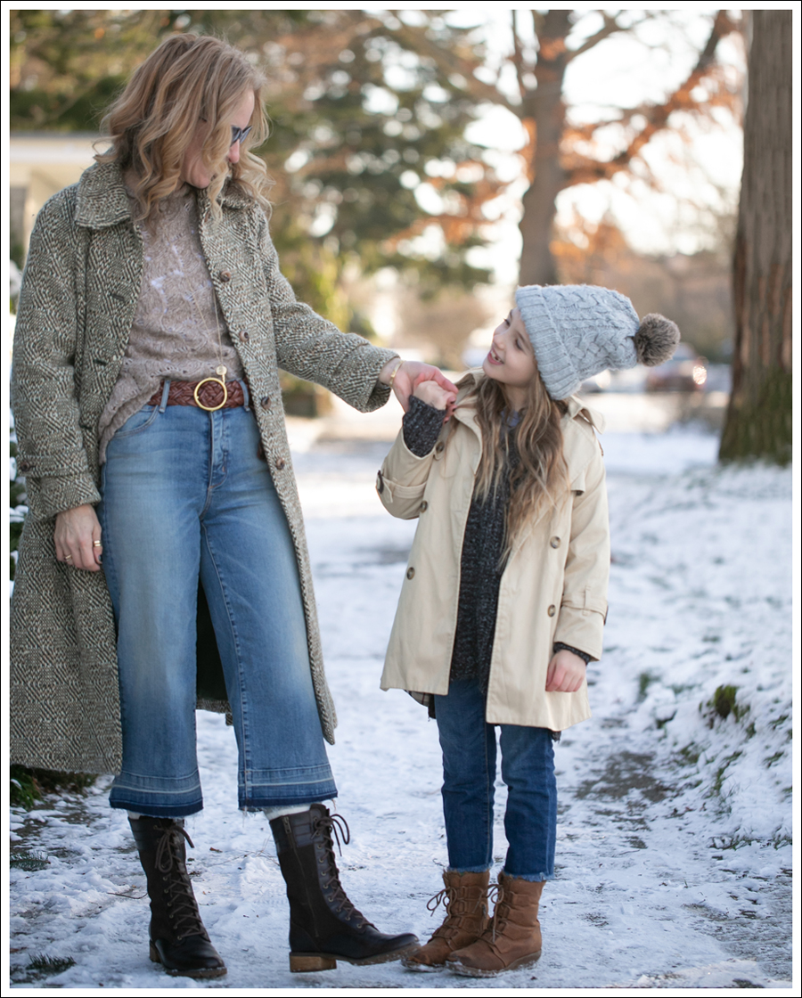 Since Maya was home from school again, she did it too!  I wore these jeans in Mexico, and it’s so funny how they look like completely different jeans styled for the winter! When you see me looking at the camera, you know I had a remote malfunction, and Maya is standing by the tripod just snapping away! I love layering long sleeve tees under loose knit sweaters in the winter!  Even better if they are striped tees!  BUT…I thought that might be a bit too much for this outfit.