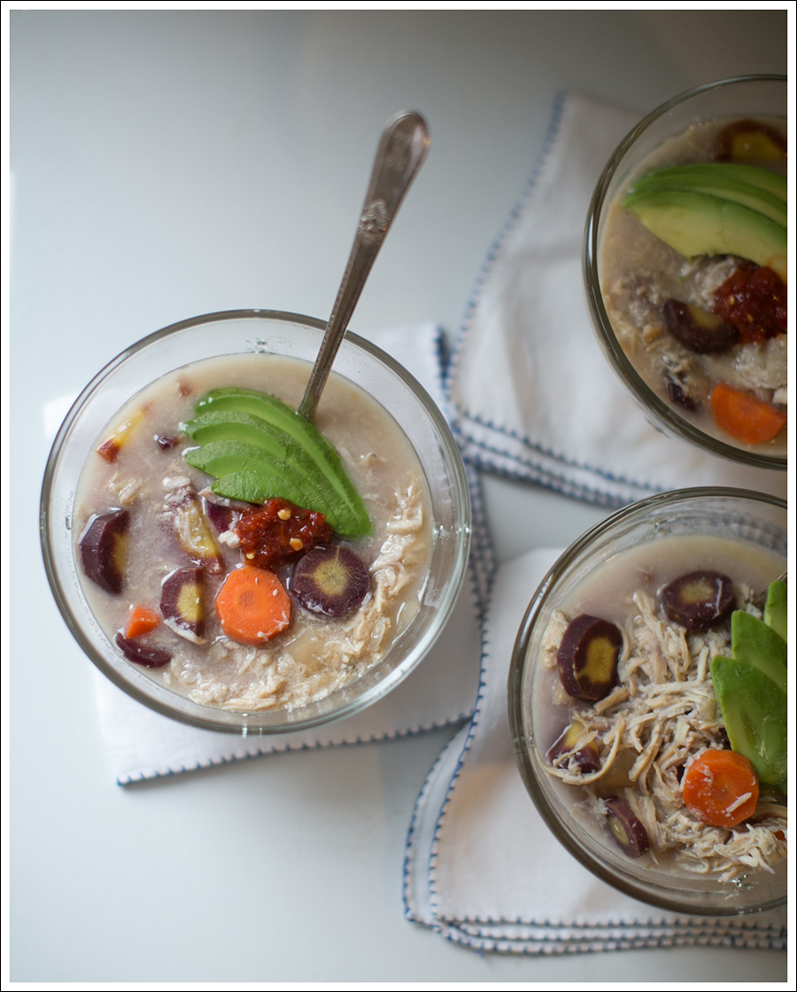 I changed my original attempt at making this, because one chicken carcass didn’t seem to wield enough flavor-mostly because I don’t like adding a litany of seasonings!. Also, my original attempt used regular noodles, so don’t despair, if you want a hearty DELICIOUS recipe, that is not Whole30…it would be delicious with any kind of noodles! And would be even more so with the two carcass addition!