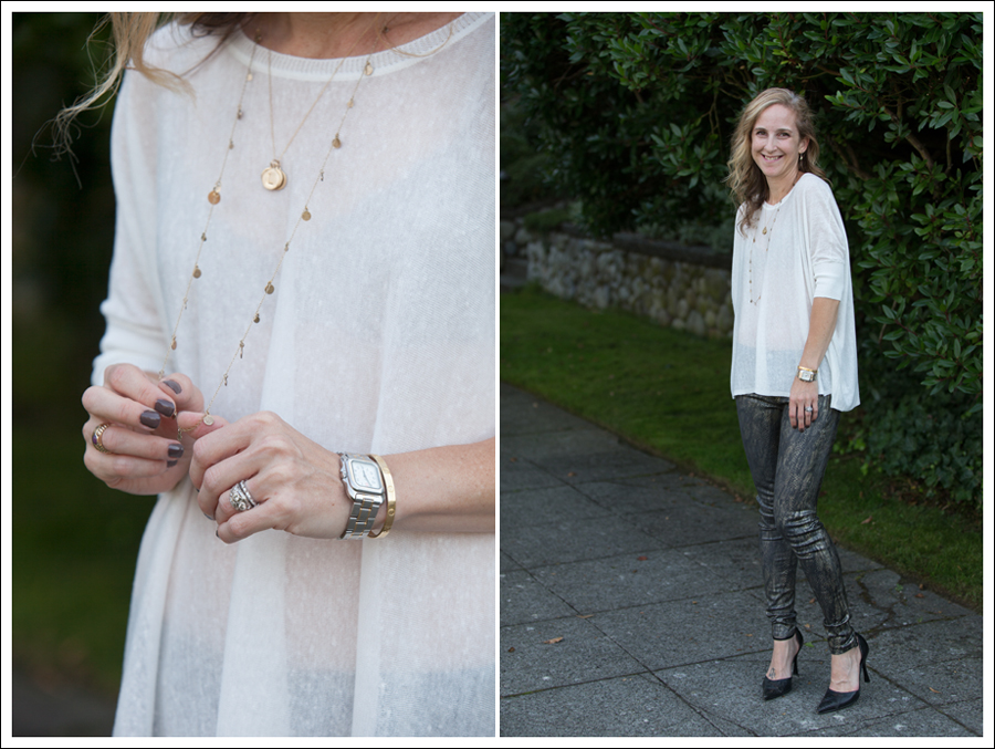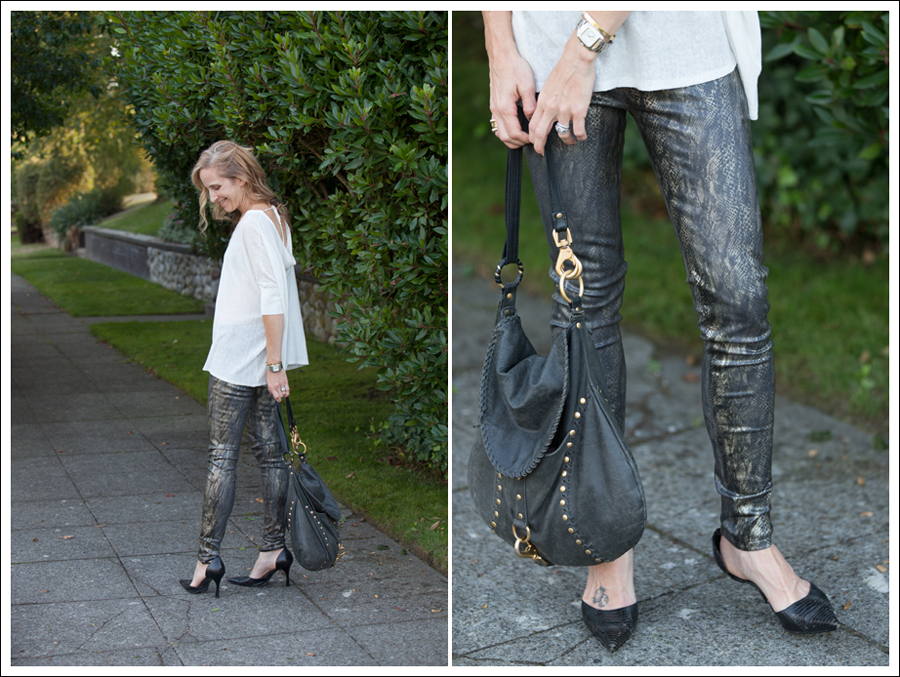 I am so drawn to printed denim (another fun way to mix up my denim addiction!), yet I get caught up on how to wear it. I’ve decided I’m not one of those people that can mix prints and get away with it, so I keep it pretty simple with my top choices. Over the summer I wore these with a plain white/black T or tank top. Now that it’s getting colder, I thought I’d stay with the same simple color choice.