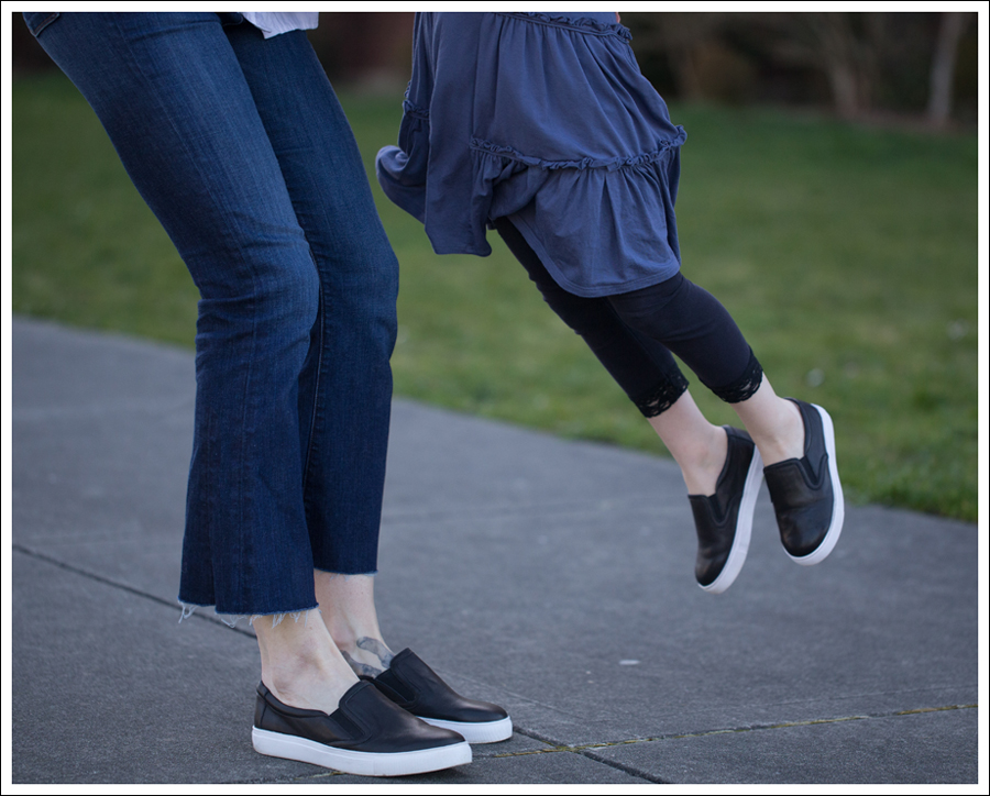 I took these pair of high rise flares (that I thrifted for super cheap!) and chopped them off at the bottom.  Crop flares are currently my favorite style, so I may or may not have chopped off a number of my flare and boot leg jeans recently! 😉  Better than buying a bunch of new current crop flares for a kazillion dollars, I say!
